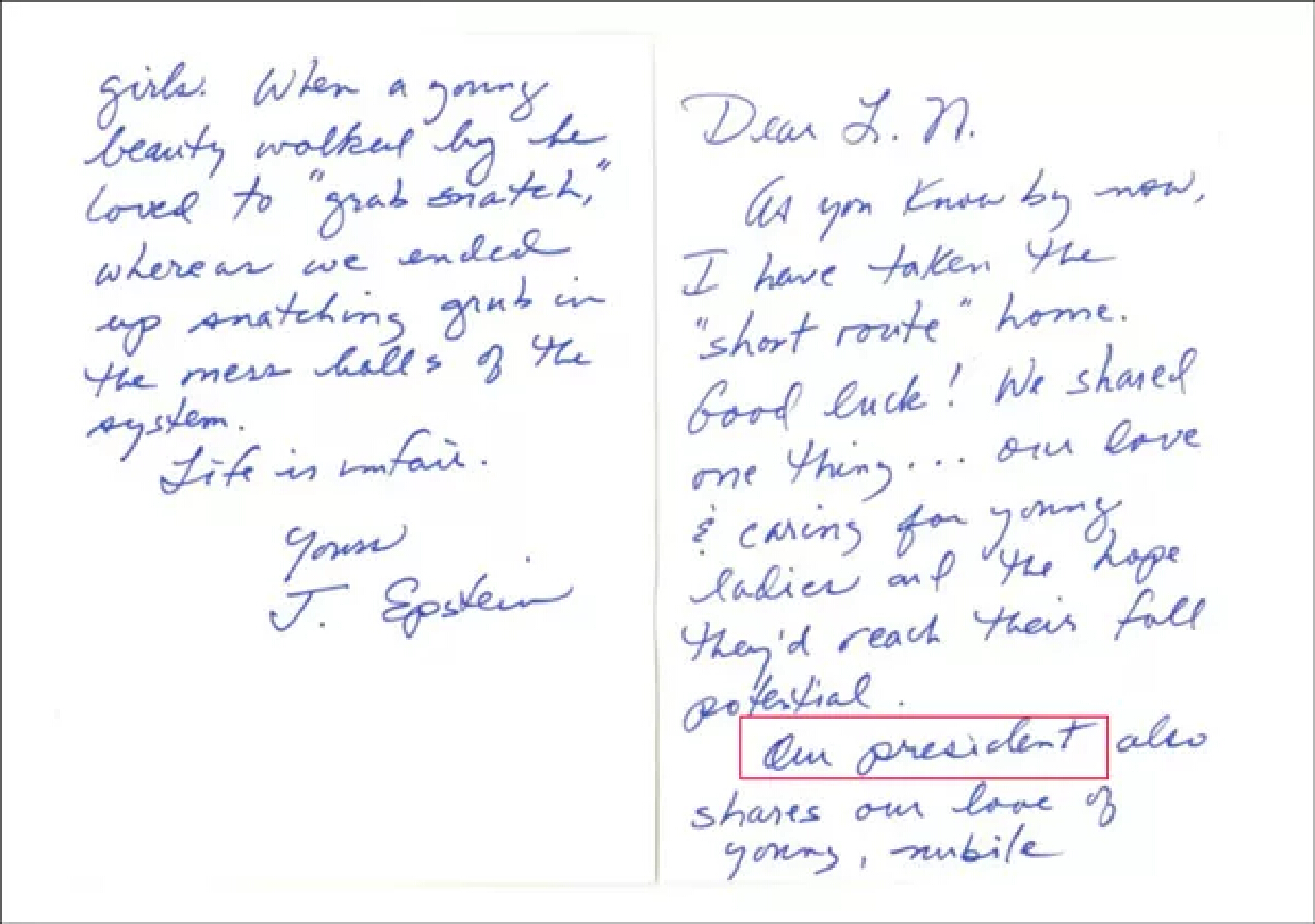 美國司法部23日一次性公開近3萬頁愛潑斯坦相關文件,不僅披露總統特朗普與愛潑斯坦往來的更多細節,也曝光了一封極具爭議的獄中信件,令案件再度發酵。文中稱兩人有一個共同點,就是喜愛年輕女性。信中還以“我們的總統”為指代,影射時任總統特朗普,稱其同樣偏好年輕貌美的女性,並以粗俗語言影射其對待女性的方式。信件末尾寫道,“生活是不公平的”。就在該信發出的當月,愛潑斯坦在獄中身亡。
