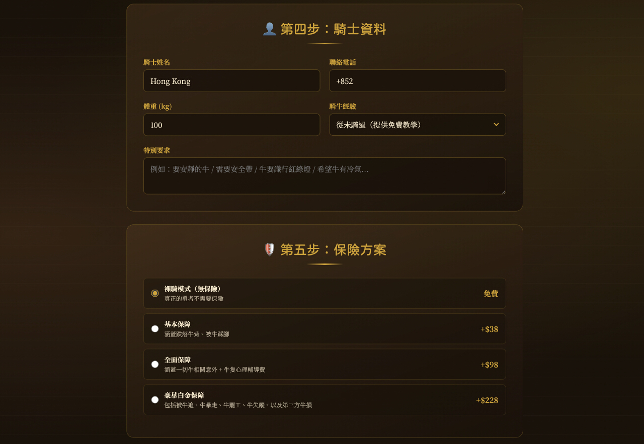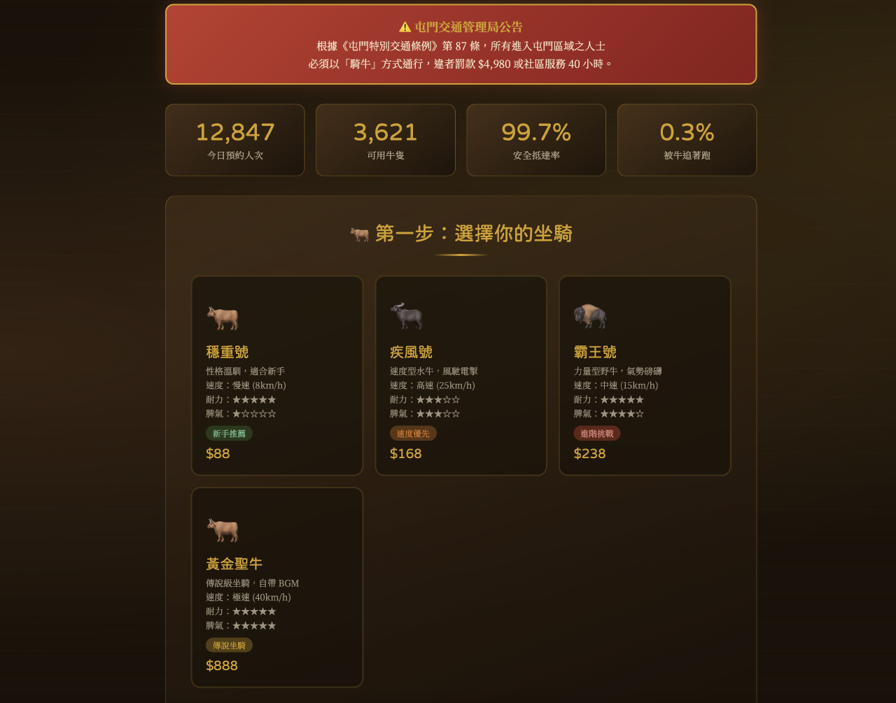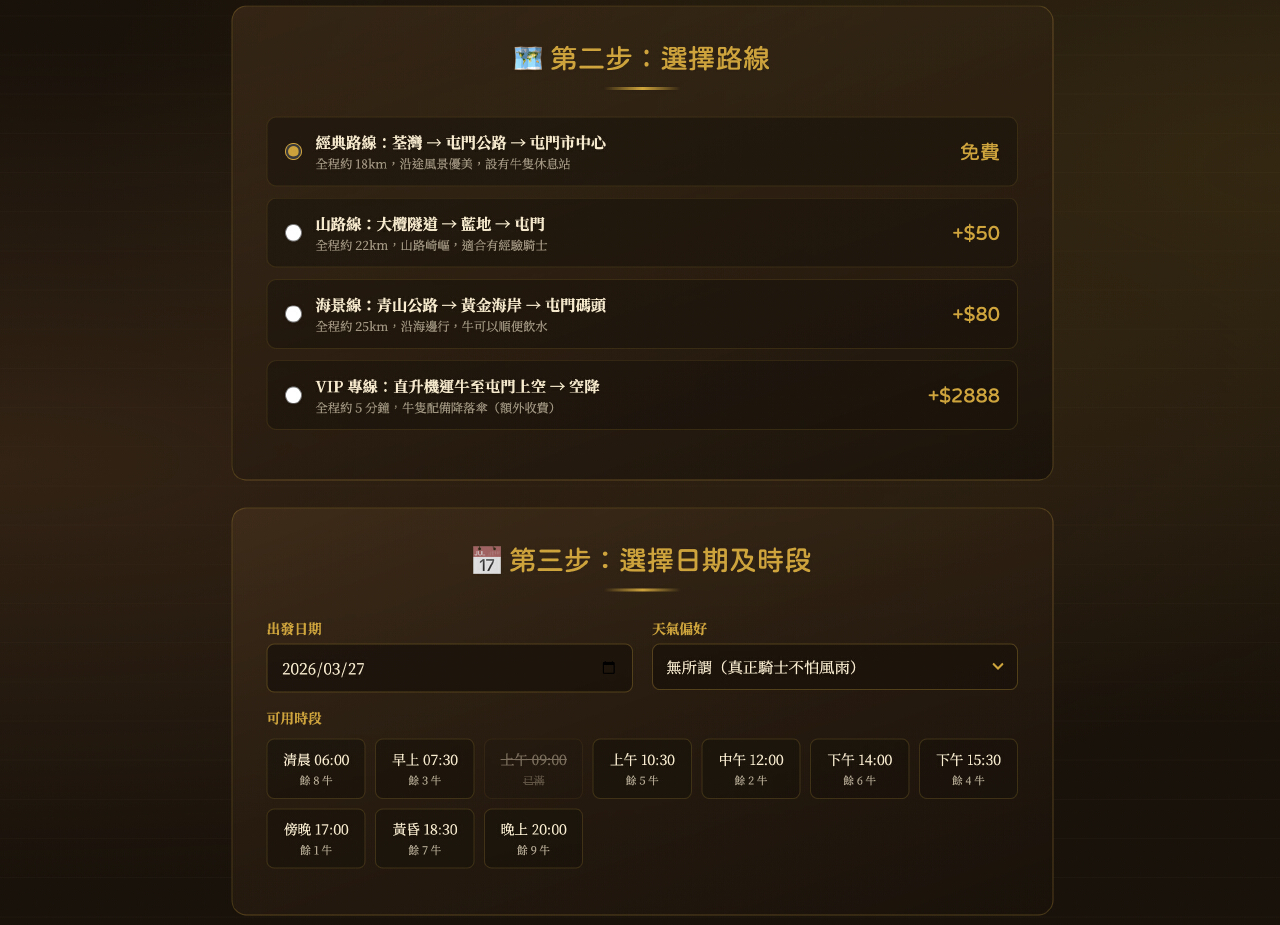 用戶進入網站後,可自由選擇坐騎、路線、日期及時段,填寫騎士資料及保險方案後,即可“騎牛上路”。系統更提供“特別要求”服務,用戶可以提出“要安靜的牛”“需要安全帶”“牛要識行紅綠燈”“希望牛有冷氣”等要求。