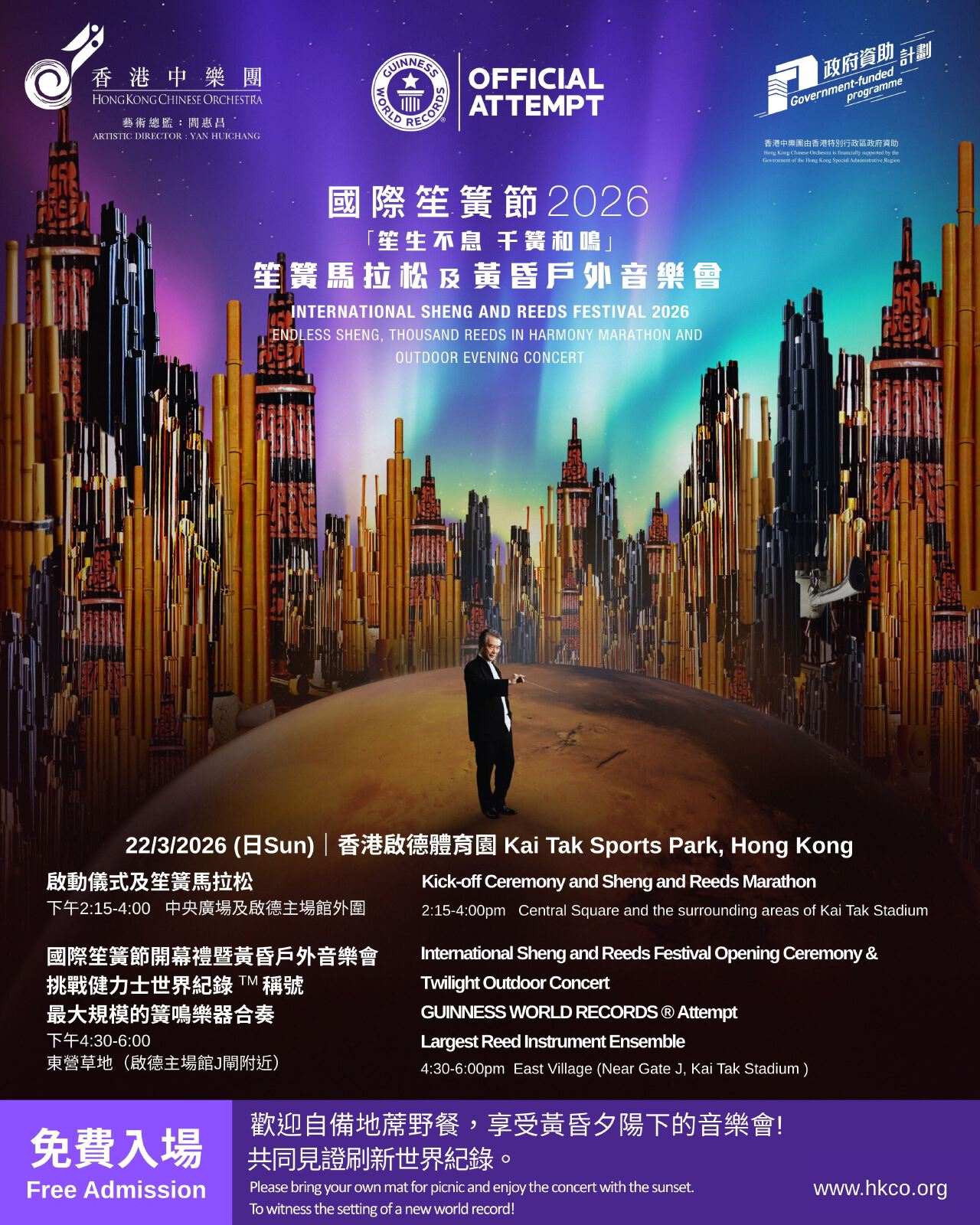 2026年3月18日電 由香港中樂團主辦的“國際笙簧節2026”將於3月22日(星期日)在啟德體育園隆重登場,首項活動“生生不息—千簧和鳴”笙簧馬拉松及黃昏戶外音樂會,免費向公眾開放,將廣邀逾千名中外簧片樂器愛好者同臺獻藝,共同挑戰“最大規模的簧鳴樂器合奏”吉尼斯世界紀錄。