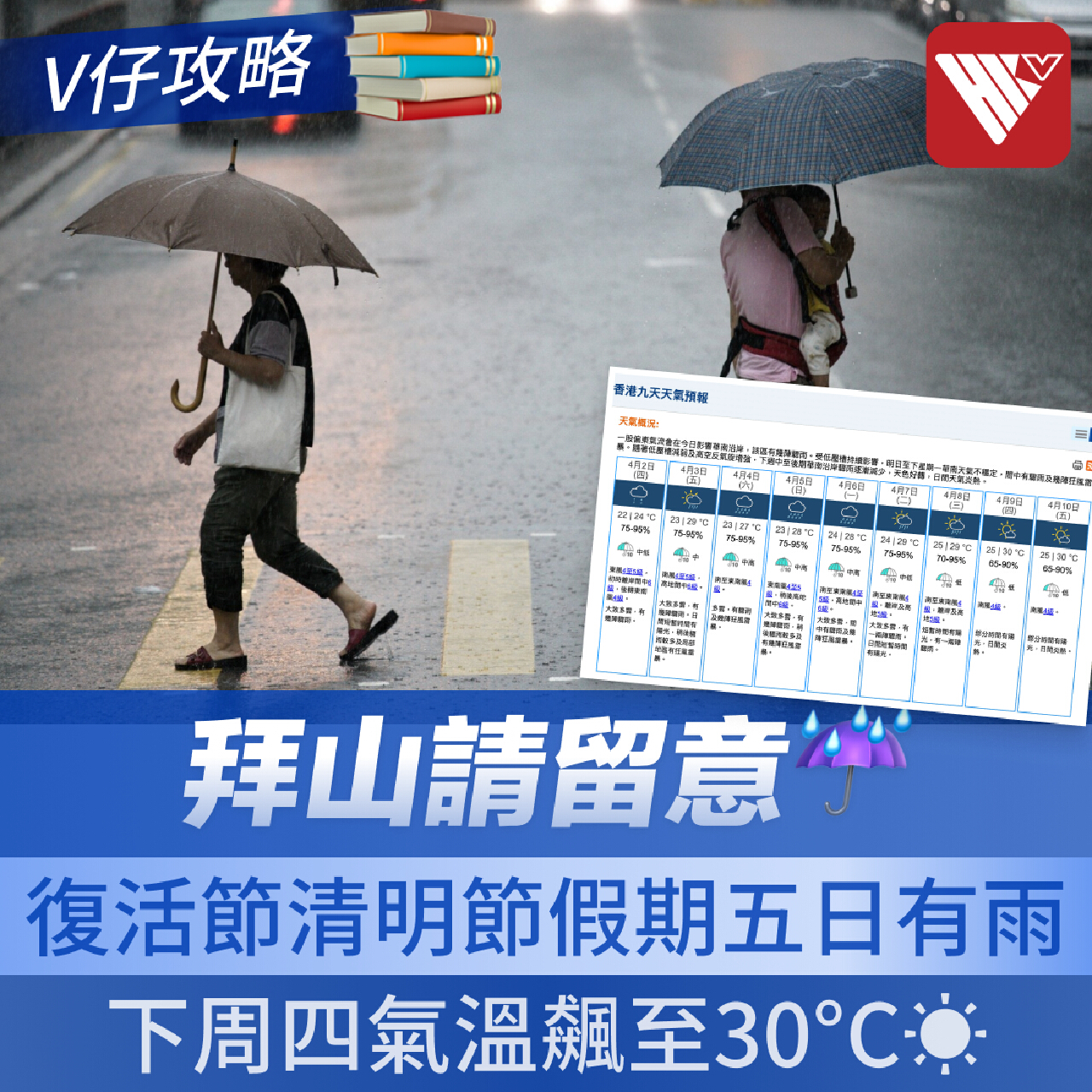 明日(3日)將開啟一連五日的復活節和清明節假期。清明時節雨紛紛,天文台表示,明日至下星期一(6日)華南天氣不穩定,間中有驟雨及幾陣狂風雷暴,下周中至後期華南沿岸驟雨逐漸減少,天色好轉,日間天氣炎熱。