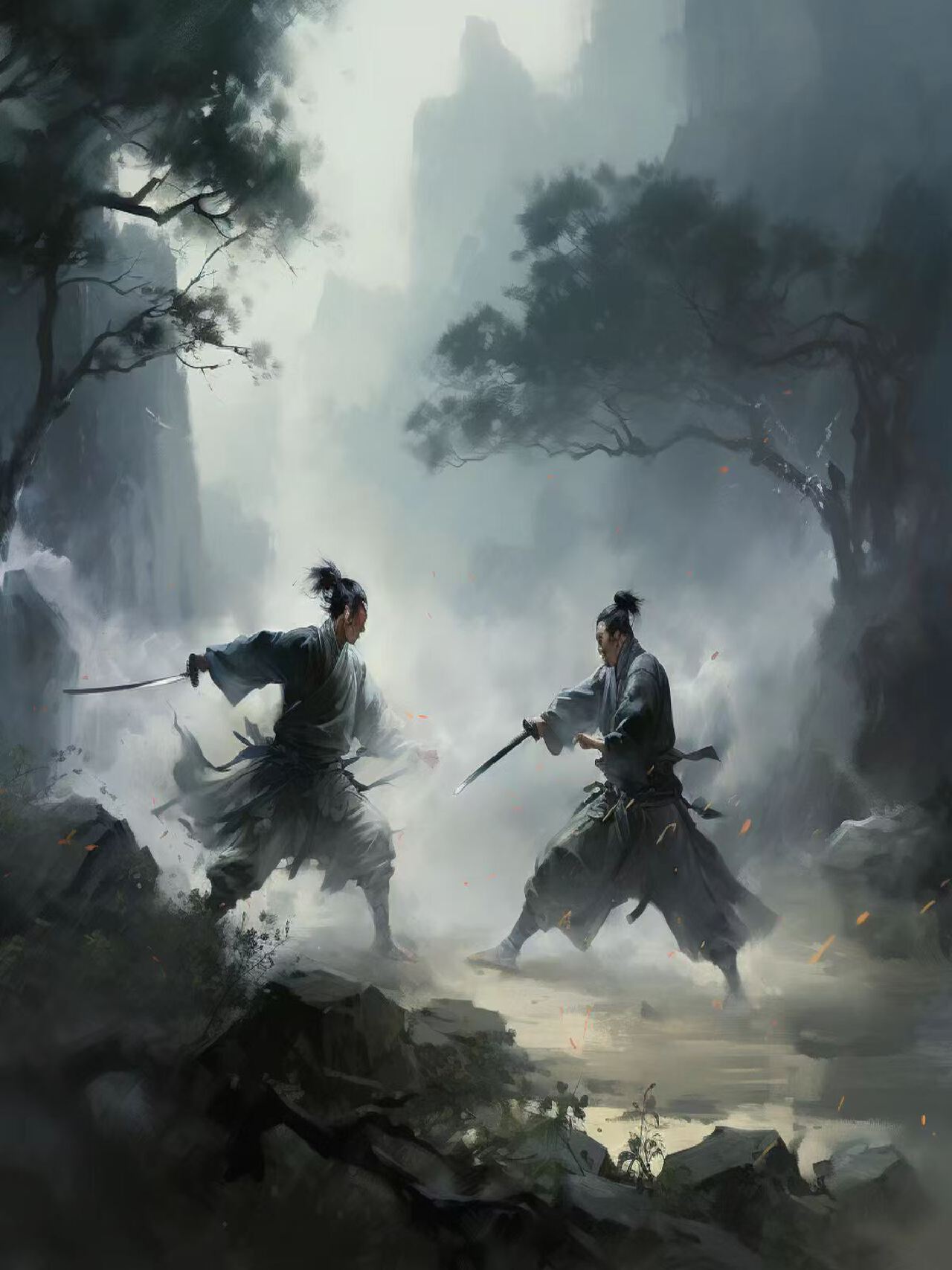 本海报以金庸武侠小说中常见的对决场景为背景,展现武林人士切磋武艺的场景。背景为雾气缭绕的森林,树木参天,营造出一种神秘和紧张的氛围,传达武侠世界中的神秘与竞争。海报的核心理念是展现武侠精神。设计将结合武侠元素和自然景观,创造出一种引人入胜的视觉故事。使用冷色调,以反映森林的幽深和雾气的朦胧。