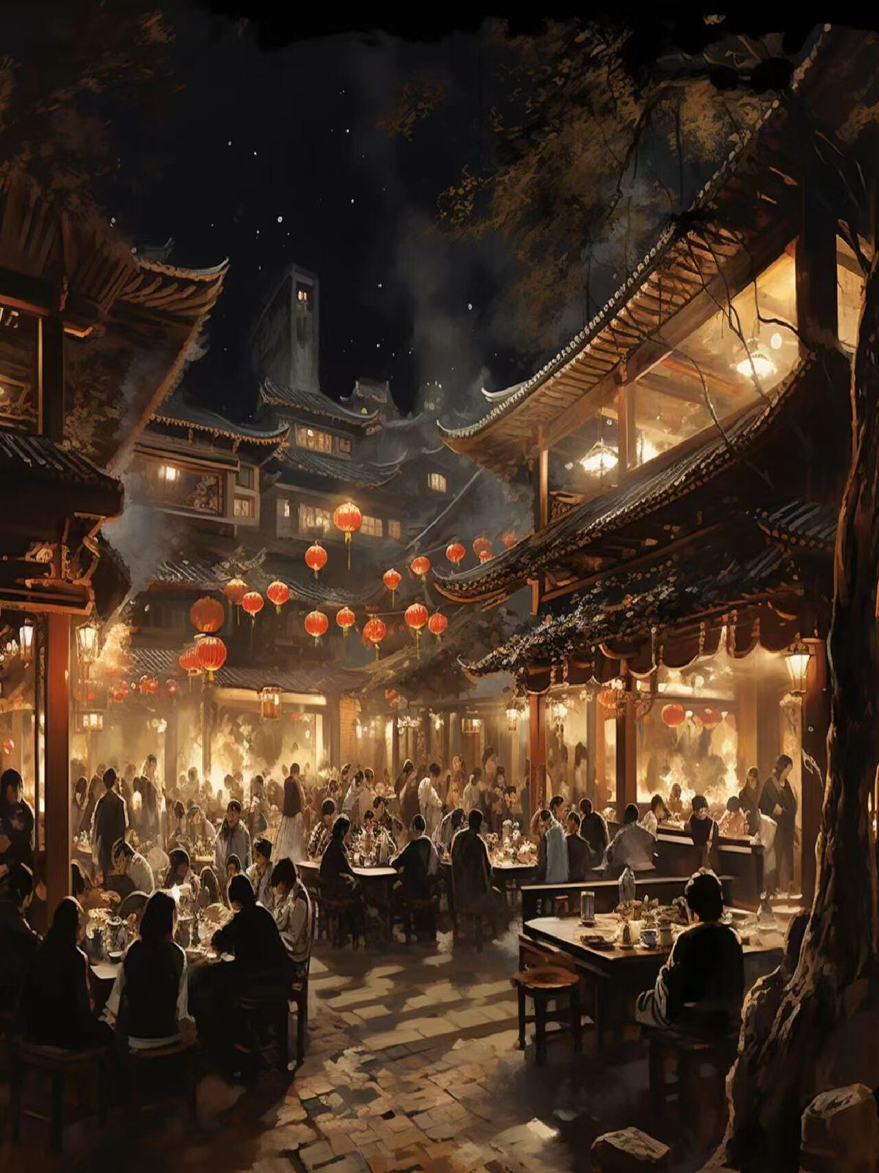 本海报以“江湖客栈”为场景,展现一个繁华的武侠世界夜晚聚会。海报通过传统中国庭院的背景和悬挂的灯笼,营造出一种热闹而充满活力的氛围。核心理念是展现武侠世界中的社交和聚会场景,通过传统中国庭院的美学和夜晚的灯光,传达出一种独特的江湖气息。一群身着传统武侠服饰的武术家在客栈中聚集,或交谈、或比武、或举杯畅饮。背景为典型的中国传统庭院,有飞檐翘角的古建筑和精美的木雕门窗。灯笼高挂,发出温暖的光线,照亮整个庭院,营造出温馨而热闹的氛围。使用暖色调,以反映夜晚的热闹和温暖。灯笼的光线和夜空的深蓝形成对比,突出夜晚的氛围。