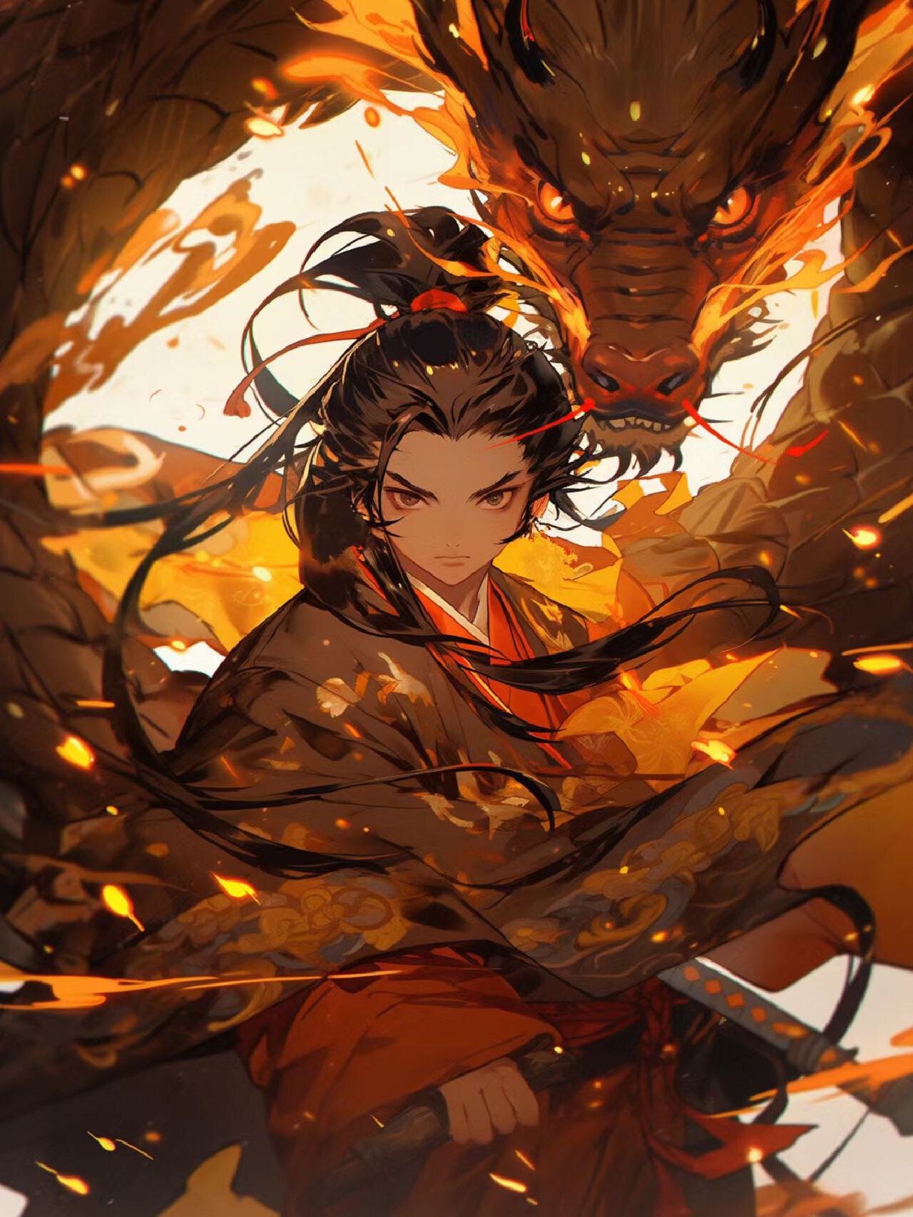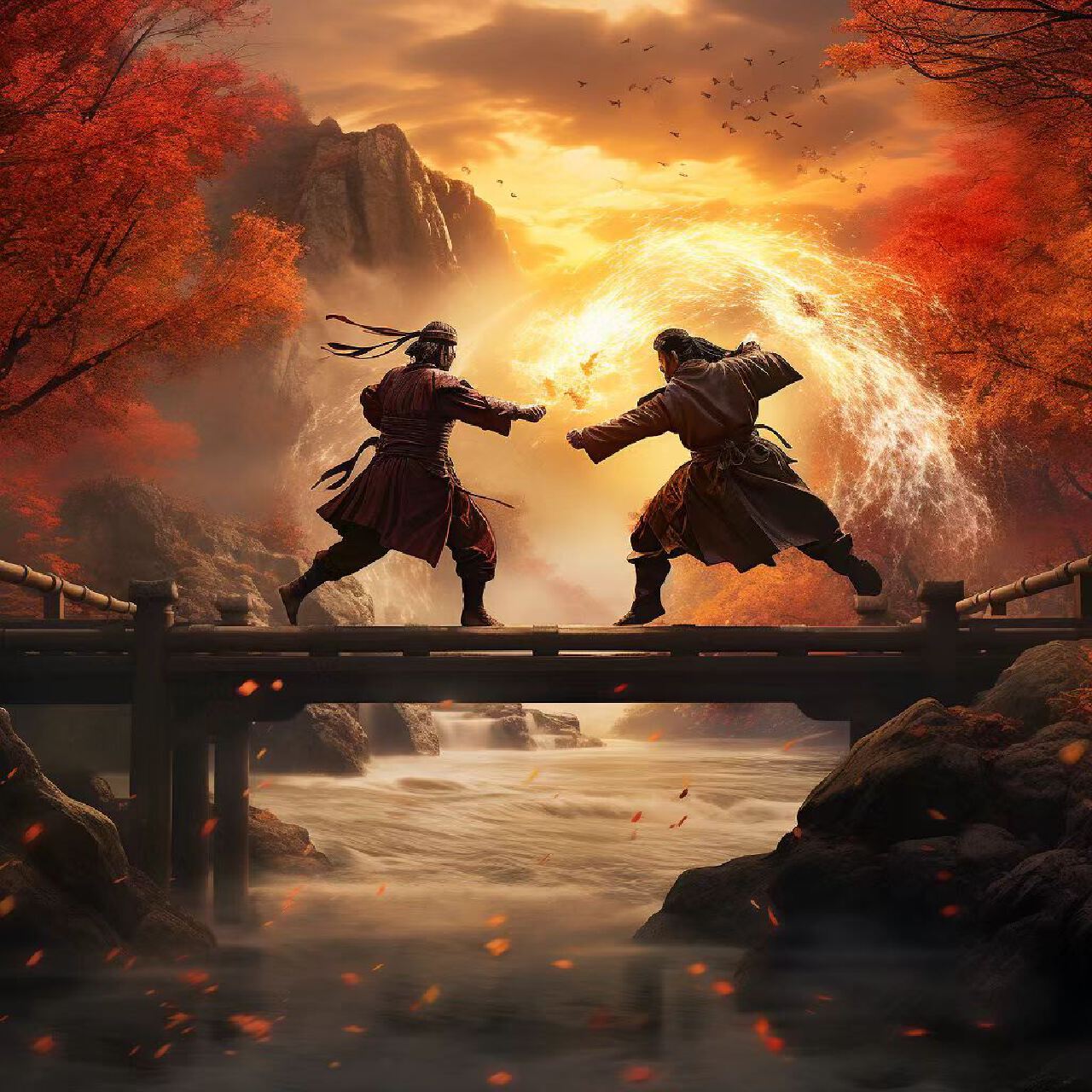 本海报以中国古代武侠世界中的江湖恩怨为主题,展现两位武术高手在古桥上对决的场景。背景是流淌的河流和秋天的落叶,以及戏剧性的日落,旨在传达武侠世界的浪漫与悲壮。海报的核心理念是通过两位武术家的对决,展现江湖中的荣誉与冲突,以及武侠世界中的忠诚与背叛。设计将结合中国古代桥梁的建筑美学和自然景观的壮丽,创造出一种戏剧性和诗意的氛围。两位身着传统武术服饰的武术家在古桥上对峙,动作充满张力。古桥结构精美,横跨在流淌的河流之上,河水反射着夕阳的光辉。背景是秋天的景色,落叶纷飞,天空中挂着一轮戏剧性的日落。使用暖色调,如橙色、红色和金色,以反映日落的光辉和秋天的色彩。色彩搭配需体现戏剧性和浪漫,同时传达出武侠世界的悲壮。