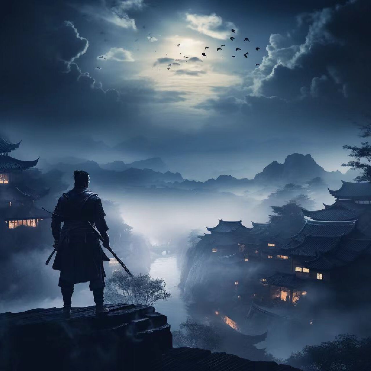 本海报以武侠世界中的剪影为主题,展现一位孤独剑客在月光照耀下的古代中国屋顶上,营造出一种朦胧而神秘的氛围。海报旨在传达武侠世界中的浪漫、孤独与冒险精神。海报的核心理念是展现武侠世界中的孤独与冒险,以及月夜下的静谧与美丽。设计将结合武侠元素和传统中国建筑的美学,创造出一种引人入胜的视觉故事。一位身着传统武侠服饰的孤独剑客,以剪影的形式呈现,手持长剑,站在屋顶上。背景为古代中国屋顶的轮廓,屋顶线条流畅,层次分明。月光从天空洒下,为整个场景增添一层神秘的光辉。周围环绕着薄雾,营造出朦胧的氛围。使用冷色调,反映夜晚的宁静和神秘。色彩搭配体现夜晚的氛围,同时传达出旅程的孤独和宁静。
