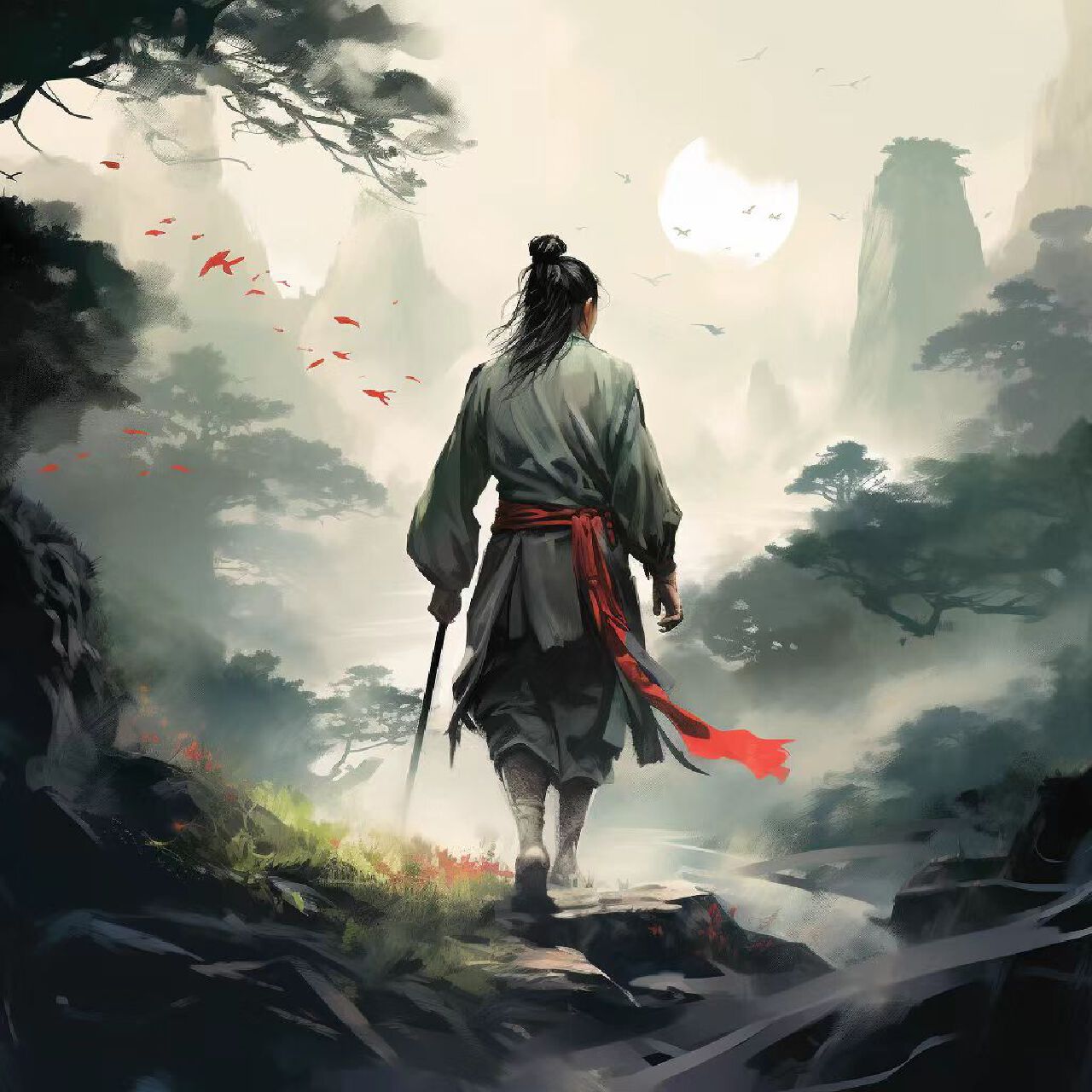本海报以一位流浪剑客的孤独旅程为主题,展现其穿越传统中国山水和森林的武侠冒险。海报旨在传达武侠世界中的自由精神和探索未知的勇气。海报的核心理念是展现武侠世界中的孤独旅行和冒险精神,以及剑客与自然和谐共存的意境。设计将结合武侠元素和传统中国山水画风格,创造出一种古典而神秘的视觉体验。一位身着传统武侠服饰的剑客,手持长剑,独自行走在旅途中。背景为连绵起伏的远山,山间云雾缭绕,增添神秘感。前景为茂密的森林,树木参天,小径蜿蜒,剑客正穿越其中。使用传统中国山水画的色彩,如墨黑、翠绿、赭石等,以传达古典和自然的氛围。色彩搭配体现武侠世界的神秘和冒险,同时传达出旅程的孤独和宁静。