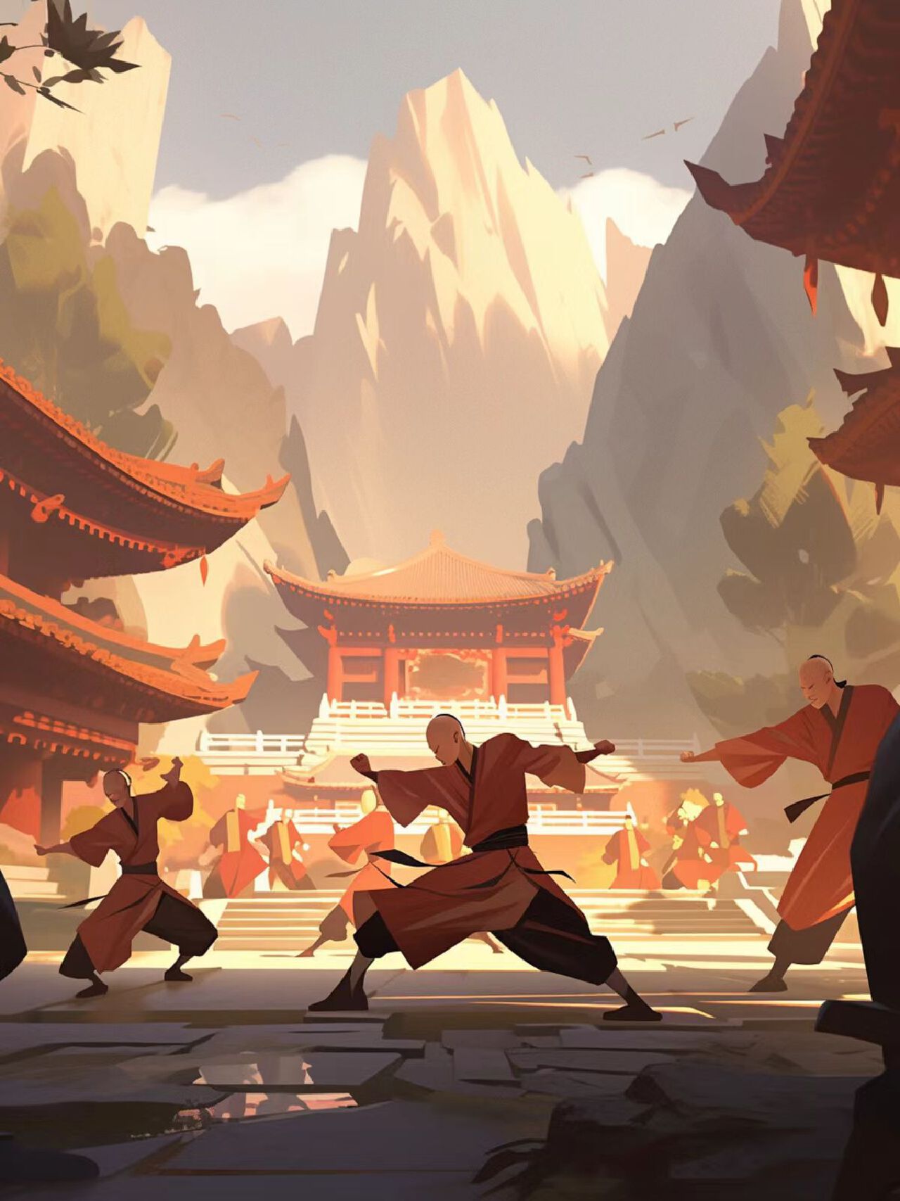 本海报以少林寺的僧侣们练习武术为主题,展现中国古代建筑与宁静的山景背景,以及传统的功夫文化。海报旨在传达少林武术的精神内涵和历史传承,同时吸引对武术和中国文化感兴趣的观众。海报的核心理念是展现少林寺僧侣们修行武术的宁静与专注,以及少林武术的传统与精神。设计将结合中国古代建筑的美学和自然环境的和谐,创造出一种宁静而庄严的氛围。少林寺的僧侣们身着传统僧袍,练习各种武术动作。使用传统的中国色彩,如墨黑、土黄、石青等,以传达古典和宁静的氛围。色彩搭配需和谐,以突出少林寺的庄严和武术的流畅。