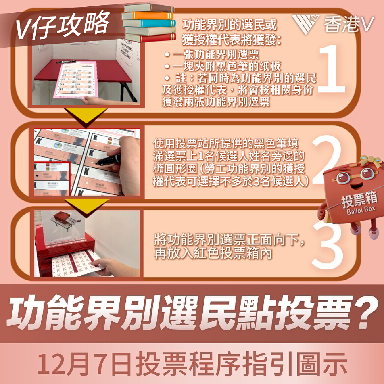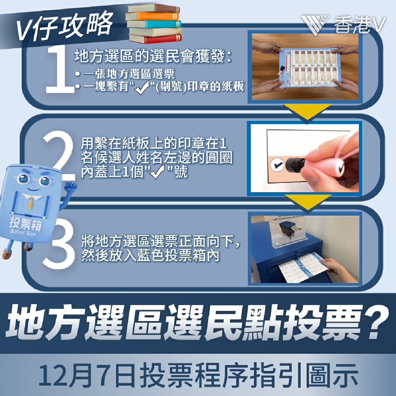 第七屆立法會選舉將於12月7日舉行,本次將選出共90位立法會議員,其中20名議員來自10個地方選區。為方便大家在投票日順利履行公民責任,V仔特別整理了“地方選區”及“功能界別”選民的投票流程圖示,讓投票步驟一目了然!