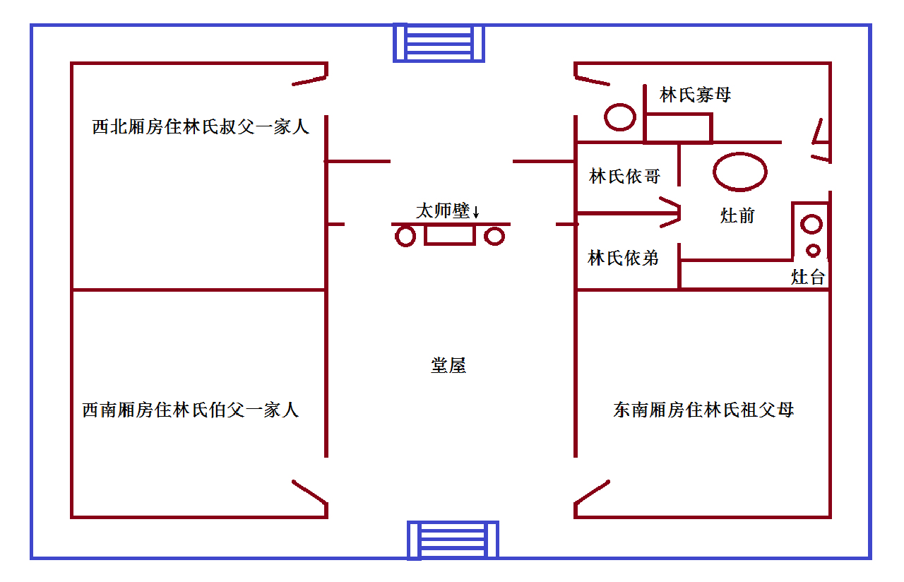 林氏的祖父母住在东南厢房,林氏的伯父一家住西南厢房,林氏的叔父一家住西北厢房。