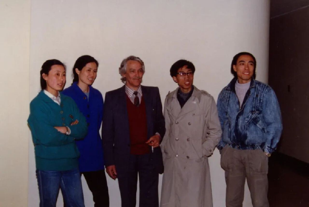 ▲ 1987年,万曼与入选瑞士洛桑“第十三届国际壁挂双年展”作者合影。左起:朱伟、施慧、万曼、梁绍基、谷文达