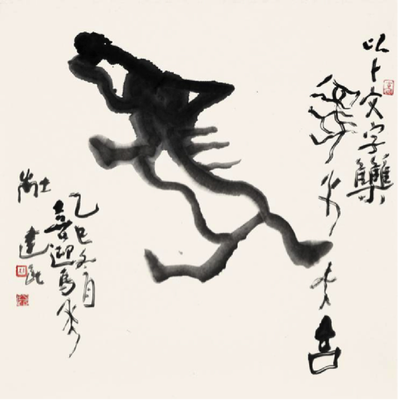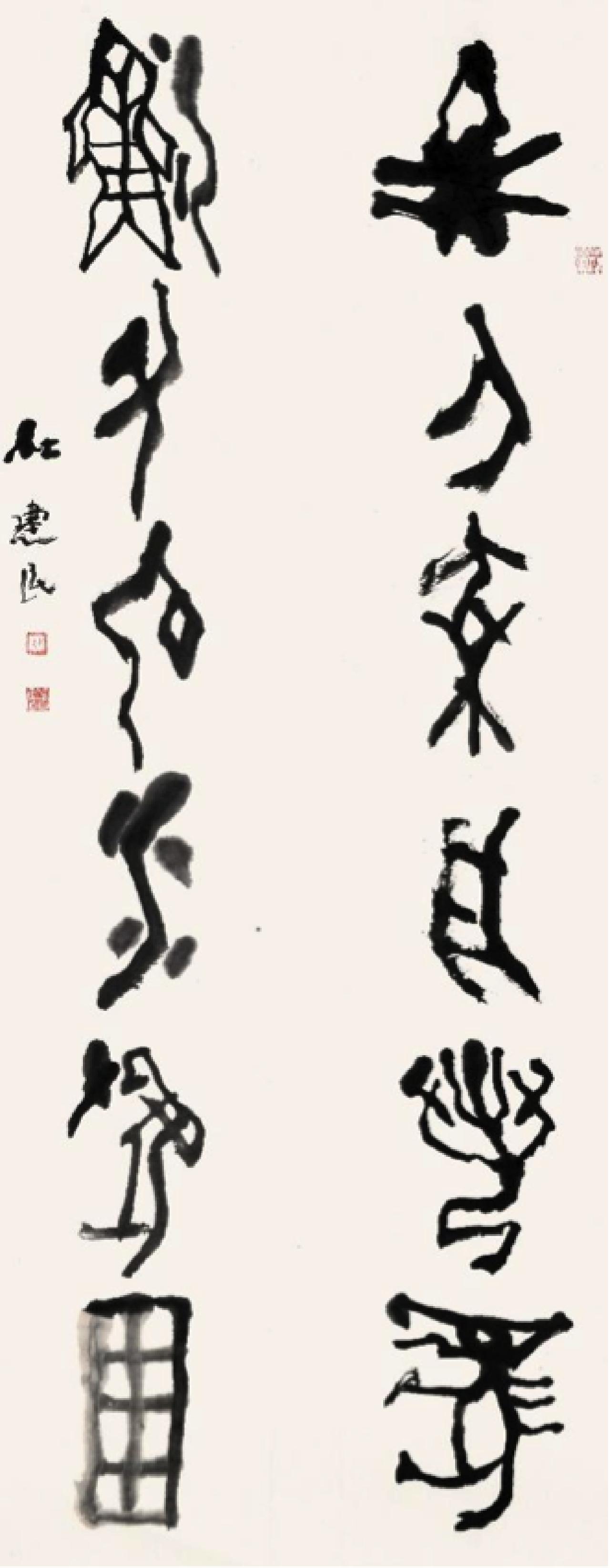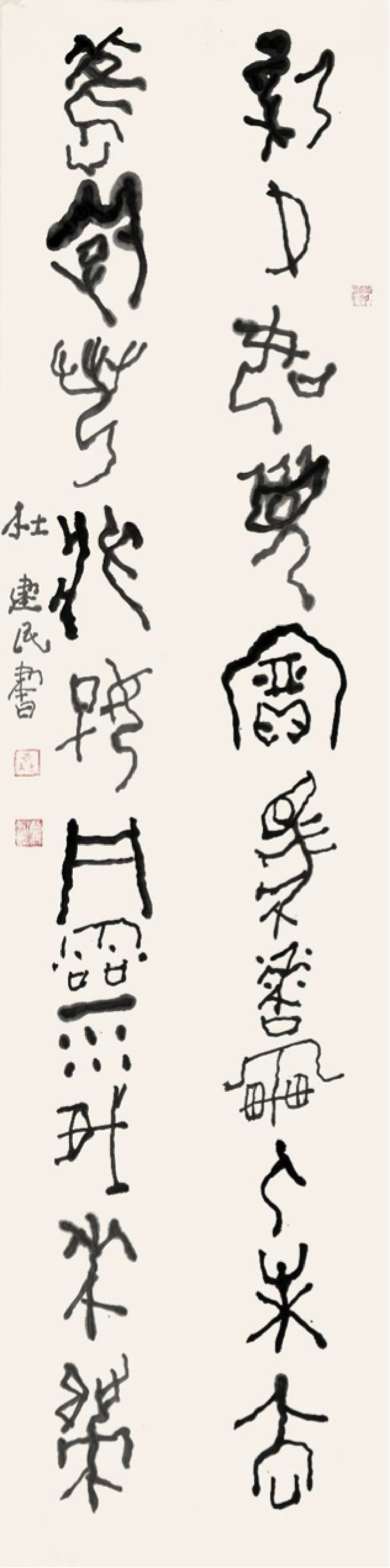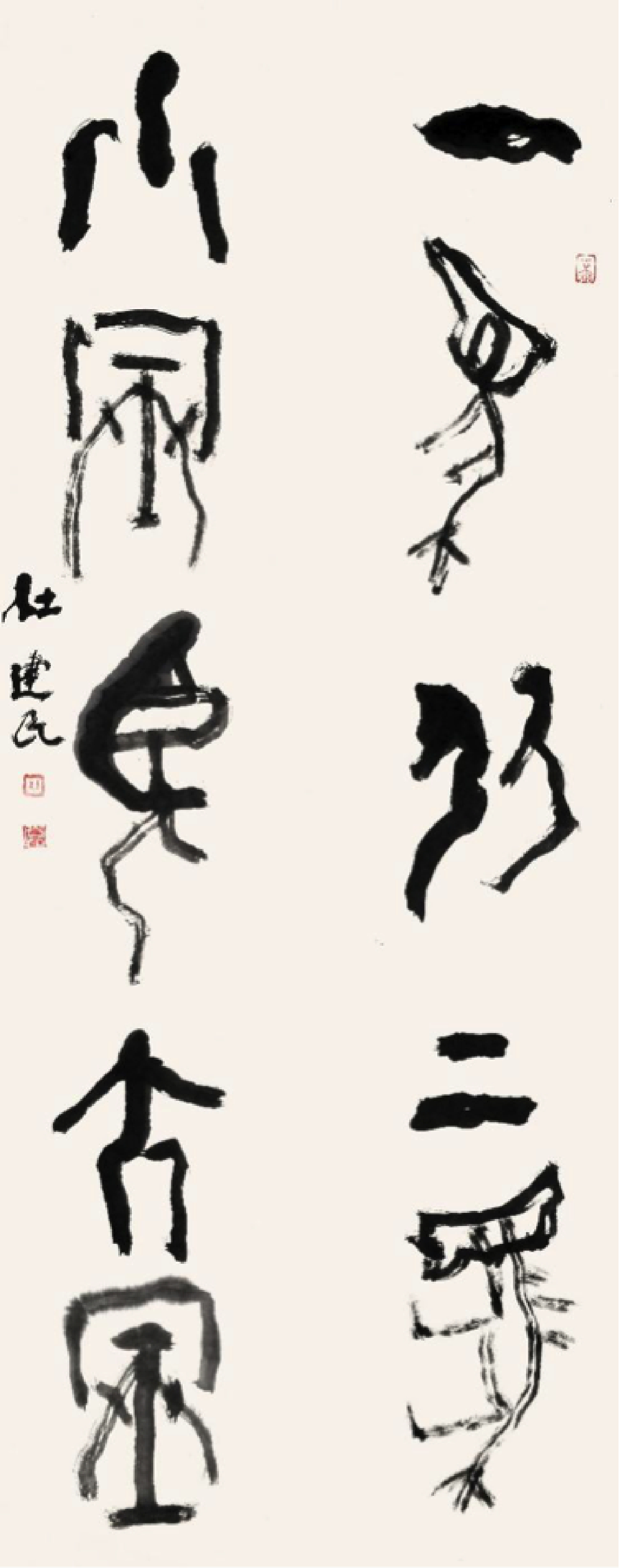 无论是中国画还是书法,都历来注重线条的艺术表达。如《新月如眉宝马香车人未去,旧游若梦好风灵雨我来归》、《一马从二马,小巫见大巫》等作品中,杜建民笔下的线条轻盈灵动,沉着痛快。其用笔劲健、泼辣,线型变化丰富,心随气运,意随笔走,于有意与无意、可控与失控之间,巧妙运用破墨之法,展现出了“写意甲骨”的独特魅力。杜建民以固守中国传统书法精神为前提,坚持在“写意甲骨”中,收奇趣于象外,出大巧于意中,用一种当代人的智慧与才情,将书法这一传统主题演绎成一个全新的艺术世界。