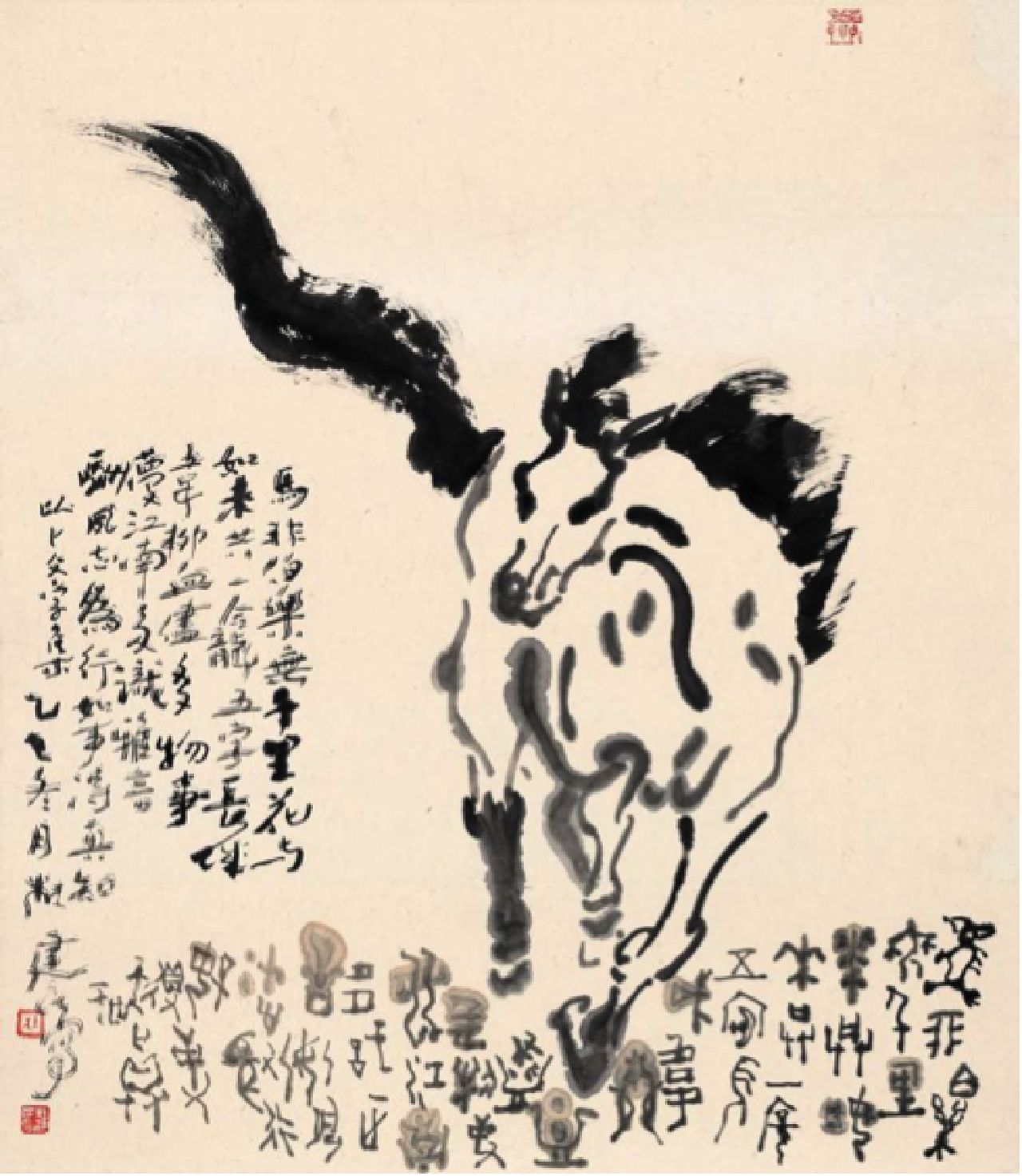 尤为可贵的是,杜建民笔下的骏马已然超越了纯粹的形似与美感,升华成为一种精神文化的载体。其作品《马非伯乐无千里,花与如来共一龛》中,骏马头部微侧,尾鬃飞扬,神情坚毅,姿态从容,既有“万里可横行” 的豪迈,又不失“天行健,君子以自强不息”的坚韧。作品中墨色的干湿浓淡恰到好处,线条张弛有力,笔墨塑造有主有次,诗、书、画、印位置安排有序。书与画之间相互呼应,形成和谐统一的整体,将文人画的笔墨意蕴呈现得淋漓尽致。