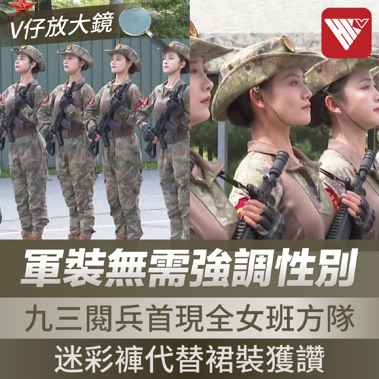 九三閱兵臨近,唯一全部由女隊員組成、首次參加紀念抗戰勝利閱兵的民兵方隊成為焦點。過往女兵常以裙裝亮相,今次女兵穿的21式荒漠迷彩蛙服採用長褲設計,在社交平台引發熱議,相關貼文下“終於不是裙子了,可喜可賀”的留言累計超過千條。許多網民認為,褲裝更符合實戰需求,亦更能展現軍人的精神面貌,女軍人無需穿強調性別的服裝。