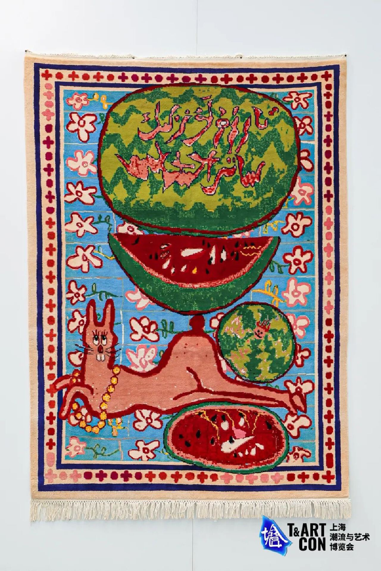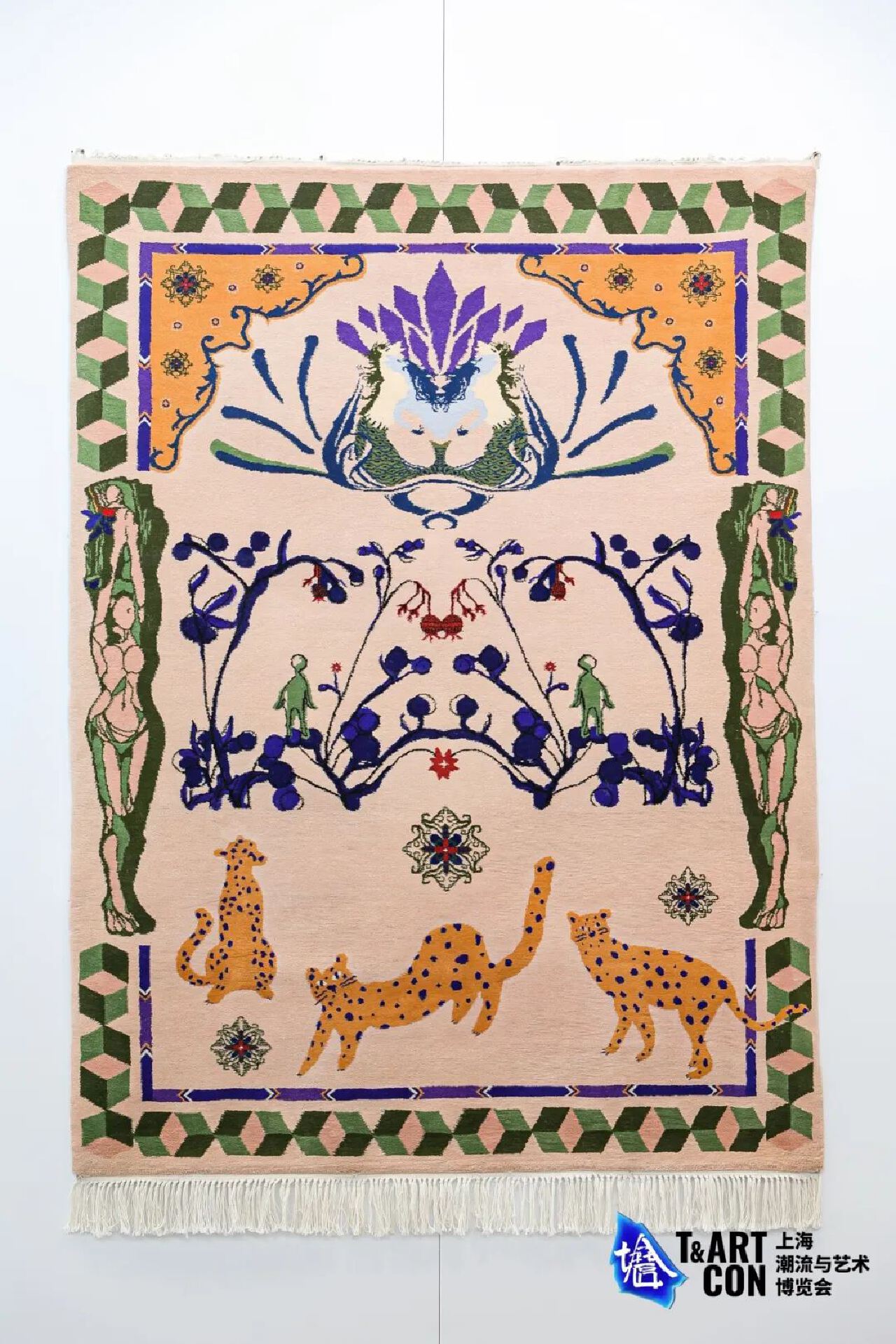 在本次上海潮博會上高台當代藝術中心主要展示了他們與五名藝術家合作的跨越半年的地毯項目。他們邀請了五位藝術家赴新疆和田,探索傳統的地毯手工藝。經過一個半月的設計和兩個月多的編制,他們最終選擇在上海潮博會首發這五件藝術家所創作的地毯。