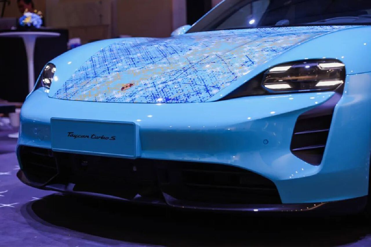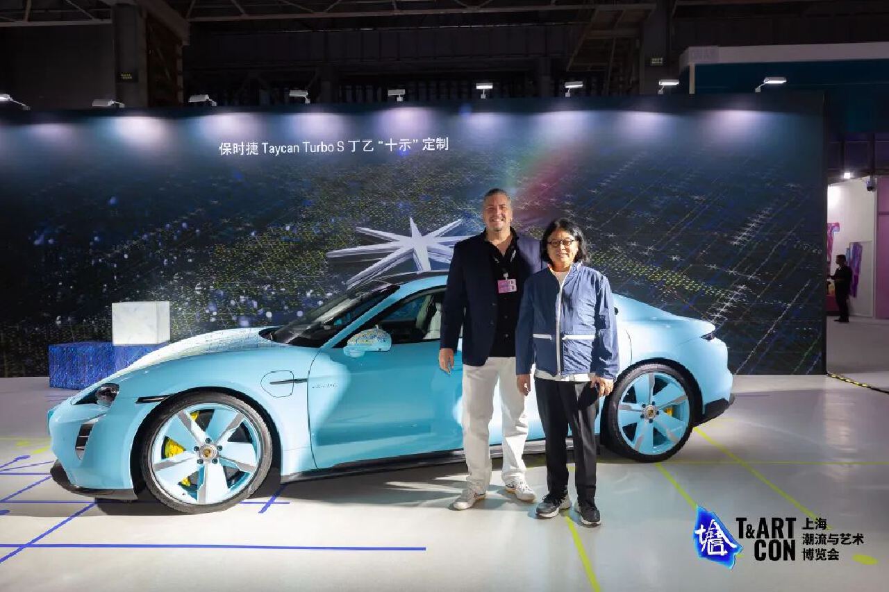回到展廳中央位置,一輛保時捷跑車同樣吸引着人們的視線。這是中國當代抽象藝術先鋒丁乙與保時捷合作的定製車型——Taycan Turbo S丁乙“十示”,將二者在電氣化時代跑車在藝術表達上的前沿推進,打造成一件流動的藝術品。