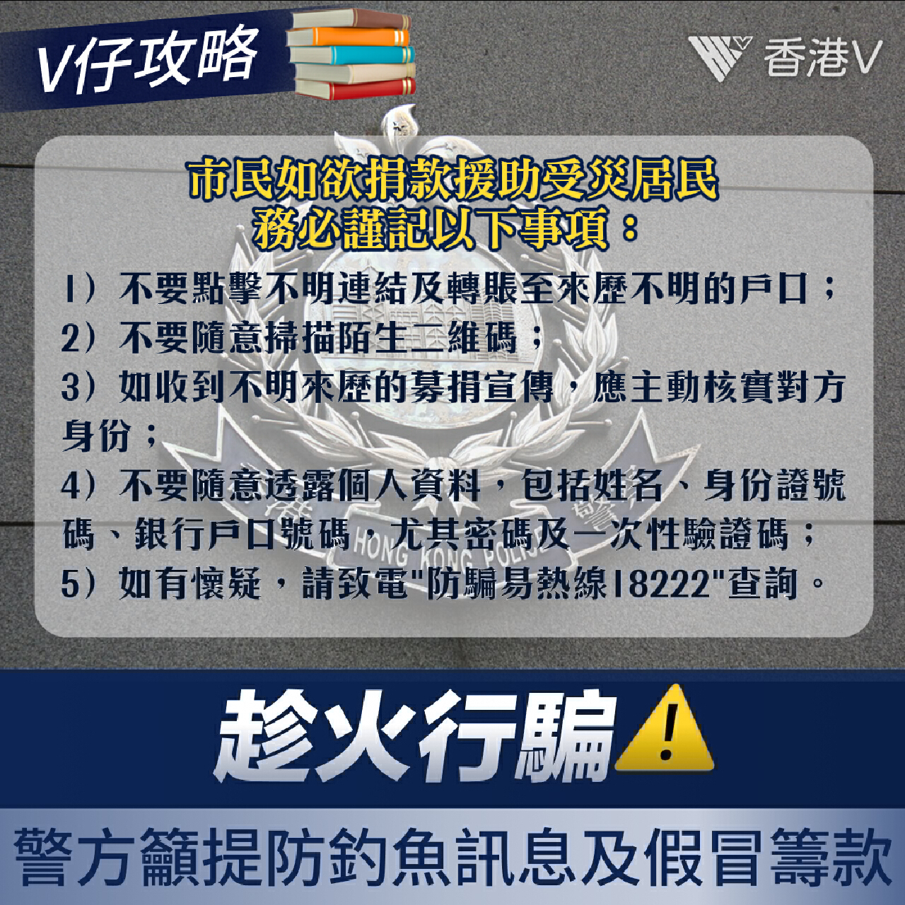 警方表示,市民如欲捐款援助受災居民,應透過官方或可靠渠道進行,並須提防騙徒利用公眾善心發起的虛假募捐。市民務必謹記以下事項: