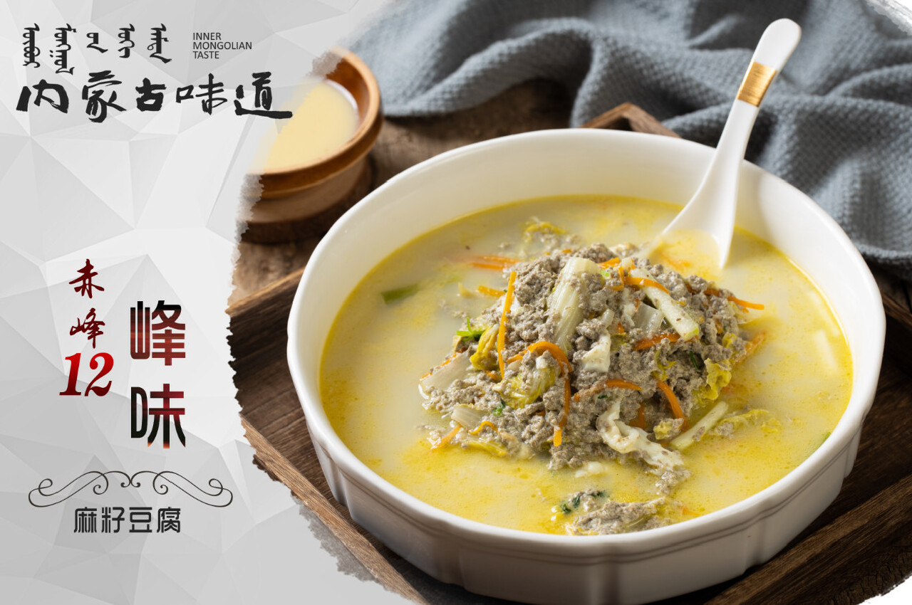 麻籽豆腐由火麻的种子加工而成,是一种优质蛋白质食品。制作好的麻籽豆腐成糊状,细而散,麻香嫩鲜,口感独特,可做成小炒麻籽豆腐、麻籽豆腐炖白菜等菜品,有润燥清肠之功效,是与众不同的地域性美食;小米饭菜包又叫打饭包。将与特制东北大酱拌匀的小米焖饭平铺在东北特产新鲜绿白菜叶上,拌上葱丝、香菜,包成四方包袱状,双手捧着吃。一口咬下去,葱香混着酱香,饭香融着菜香,存在感极强的味道舒畅地进入肠胃,东北人的豪放顷刻间在大快朵颐中得到了满足;糟米咯咯豆是赤峰传统面食,将糟米面团压出长短不齐的面条,入锅煮熟。因其面条极短,被赤峰人亲切称为咯咯豆。浇上韭菜鸡蛋卤或酸菜卤,口感细腻爽滑,微酸香甜,老少皆宜。天气炎热时,过水后的咯咯豆口感劲道、清爽消暑,是粗粮细作的经典美食。