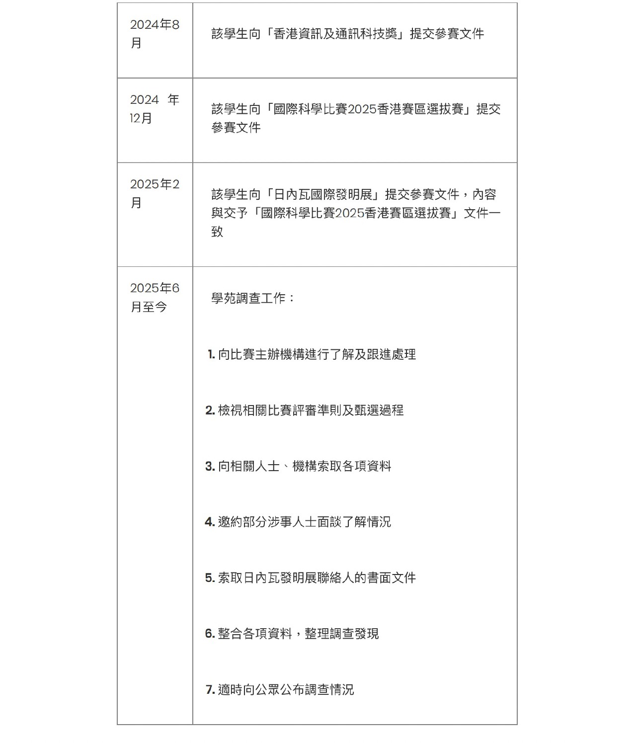 至於公眾關注的“日內瓦國際發明展”,學苑獲該比賽香港聯絡人書面回覆如下: