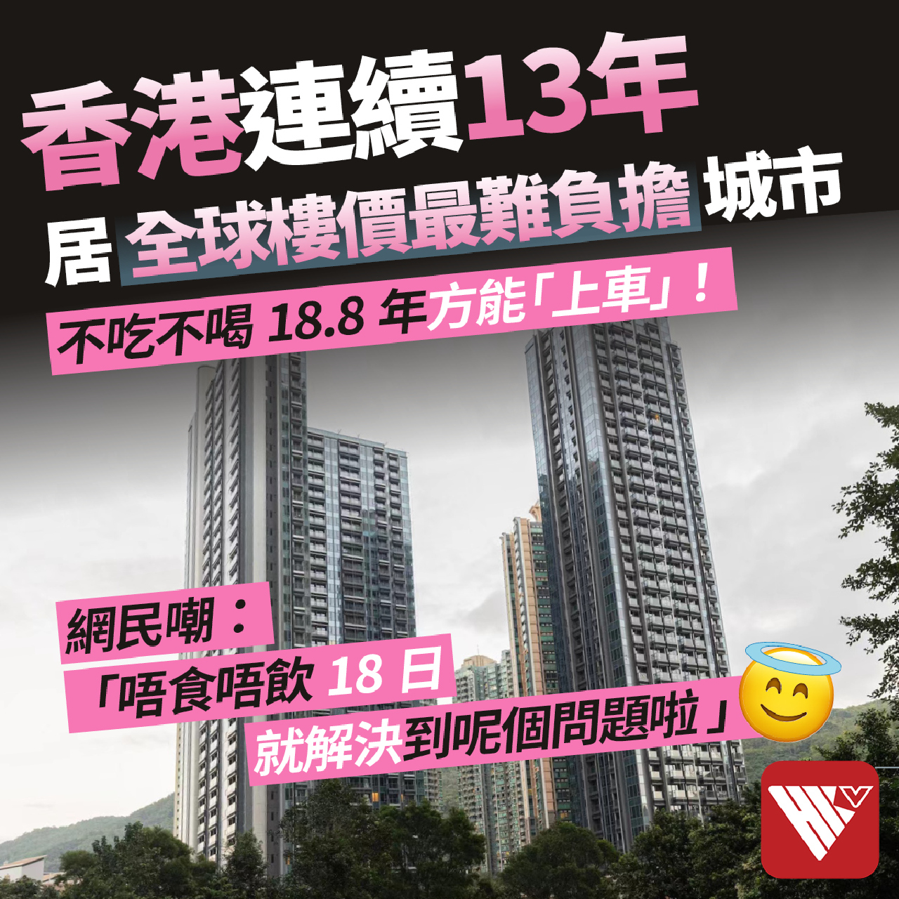其樓價中位數相對家庭入息中位數比率,由上一年度的23.2回落至18.8,為有關調查進行19年來最大幅度的改善,惟仍屬全球最高,意味著一個家庭不吃不喝18.8年才能「上車」。