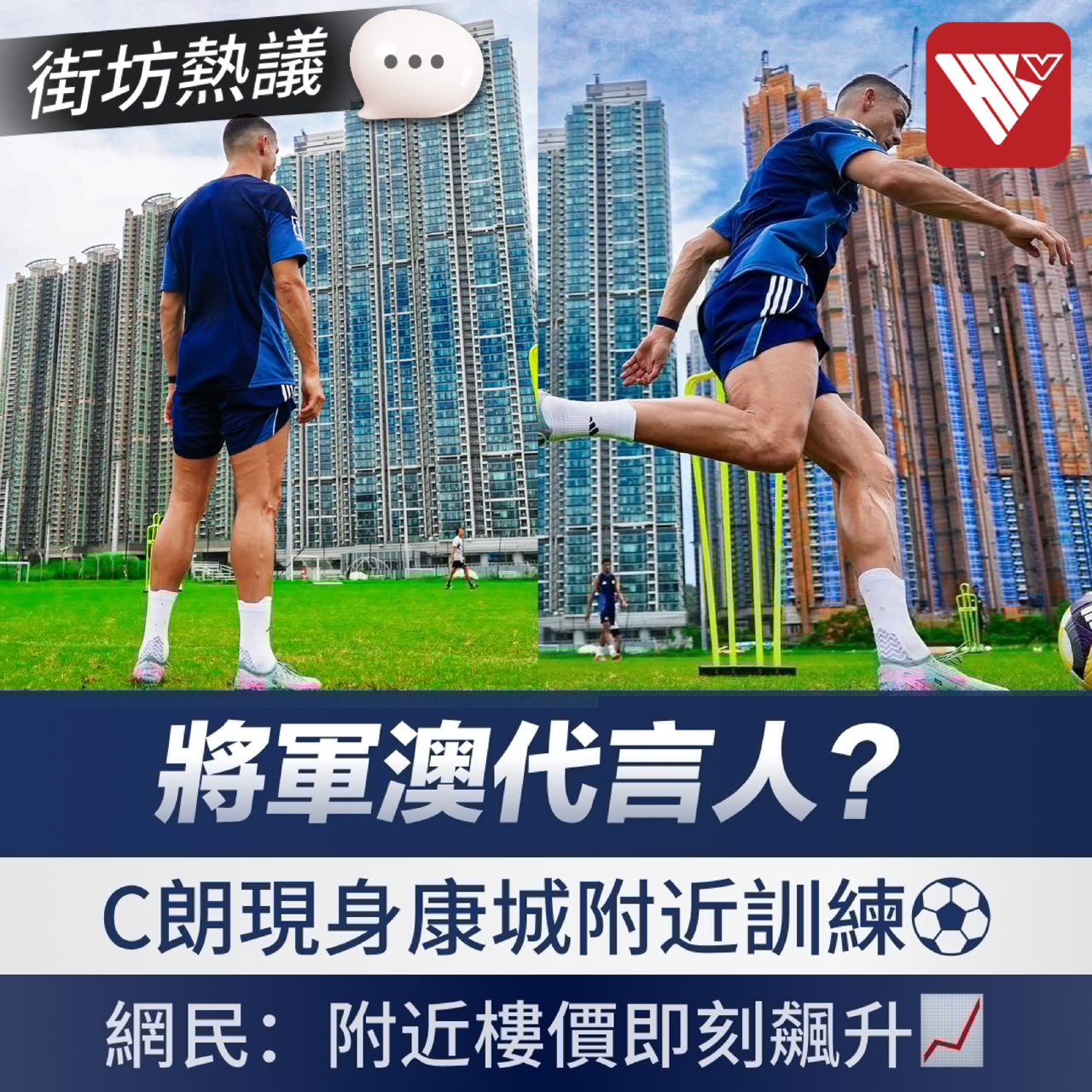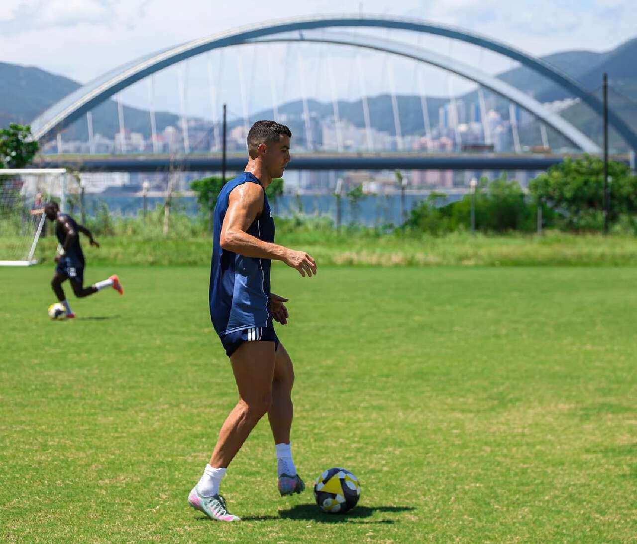 上周六(8月16日),這位“吸金王”頂著烈日現身將軍澳足球場進行賽前訓練。沙特艾納斯球隊官方發佈的照片中,只見C羅在日出康城住宅群的環繞下專注練球,背景更可見標誌性的將藍大橋,其“貼地”作風惹全城熱話。