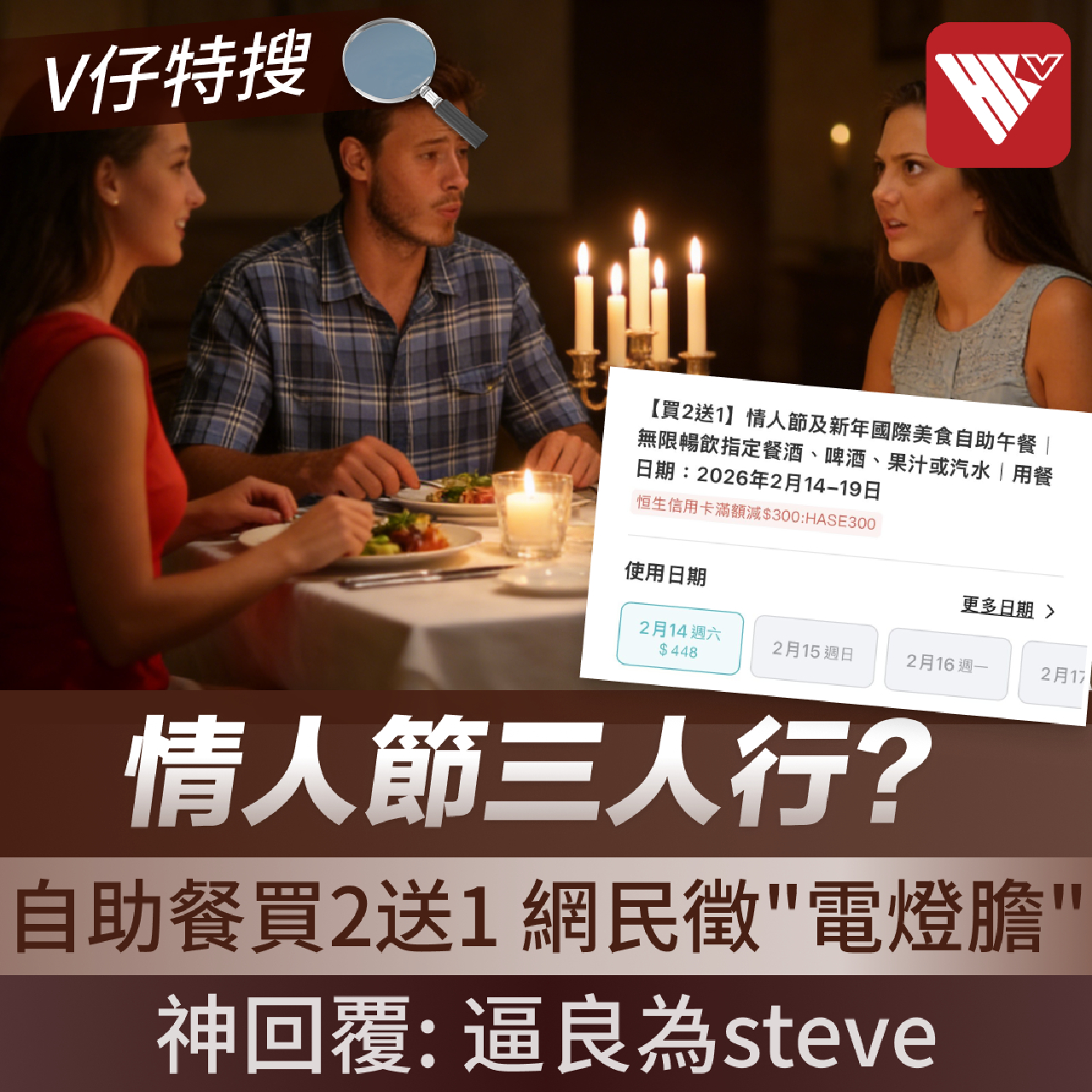 該酒店推出“買2送1 情人節及新年自助餐”優惠,規定每次需訂購3位,令網民哭笑不得,發文調侃“下星期情人節想同crush食自助餐,但個場要3個人咁去,有冇人想join埋一齊食”。