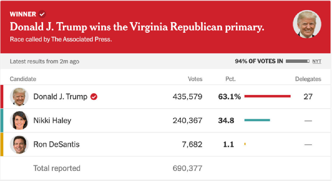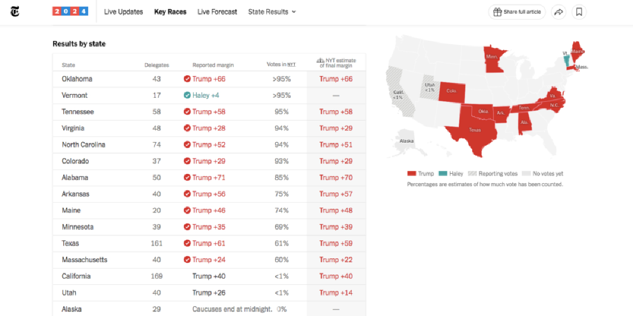 超級星期二前特朗普就已經遙遙領先,獲得了247張黨代表票,而黑利只有43張,超級星期二一共有874張黨代表票決出。特朗普拿到絕大多數之後,離票數過半就只有咫尺之遙。