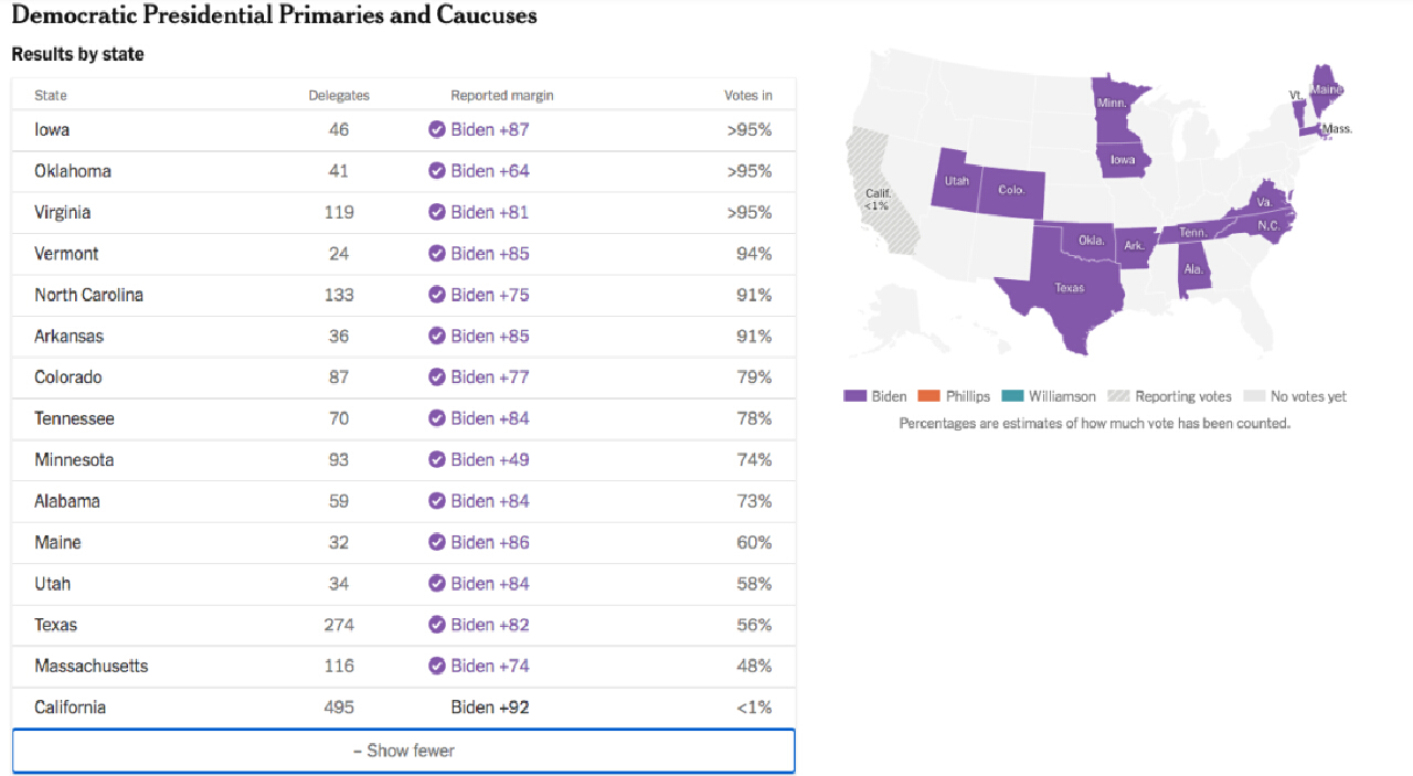 民主黨這邊規則也一樣,本次一共有3934張代表票,贏得提名需要1968張,而超級星期二這一天就有1420張黨代表票,此前拜登已經獲得了206張。預計特朗普最早會在3月12號就鎖定過半黨代表票,拜登最早可能會在3月19號。