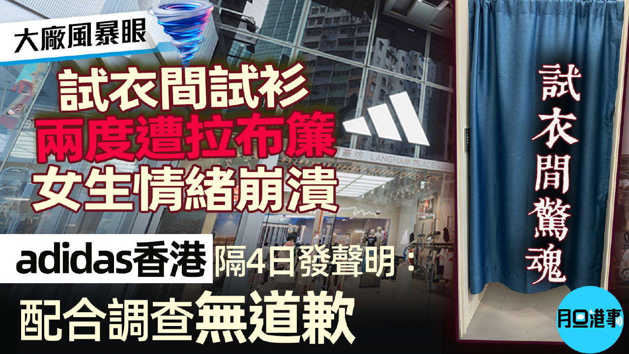 adidas位於旺角朗豪坊分店,一名21歲大學女生上周三在試身室試褲期間,先是遭兩名女子打開其試身室的簾。女事主隨即向一名男職員投訴,之後折返試身室,打算換褲後便離開。不料,該名男職員竟未經她同意下,再一次打開試身室的簾,“我呆咗,我條褲已經除到落腳眼”,事後沒有道歉,揚長而去。