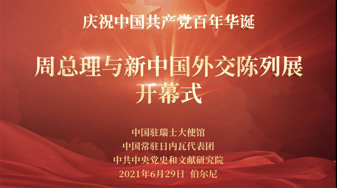 为隆重庆祝中国共产党成立100周年,6月29日上午,由中国驻瑞士使馆主办的“周总理与新中国外交陈列展”在瑞士首都伯尔尼开幕。常驻联合国日内瓦办事处和瑞士其他国际组织代表陈旭大使、中央党史和文献研究院副院长黄一兵、驻瑞士大使王世廷出席活动并为陈列展揭幕。