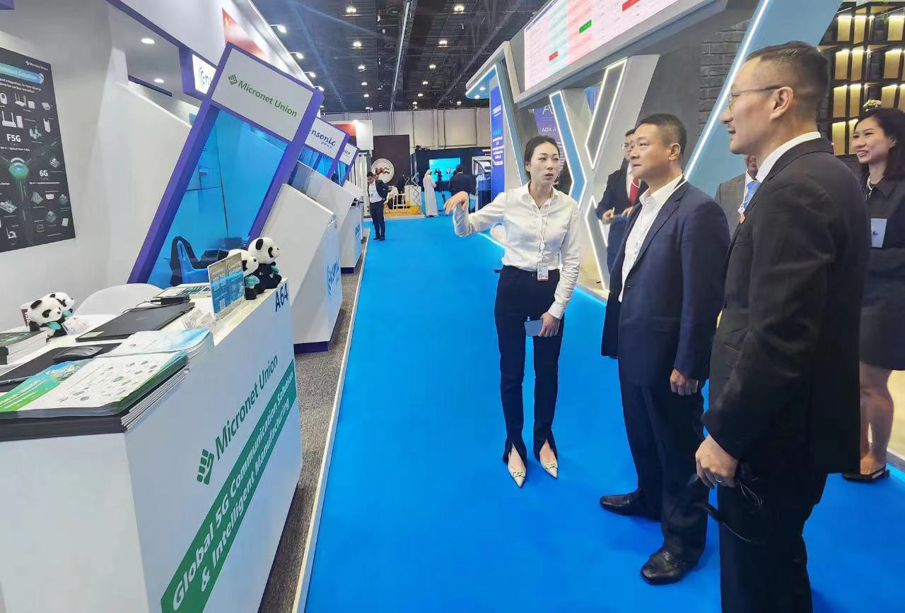 天风国际行政总裁邹传向浙商银行行长张荣森介绍展会情况,图为微网优联展位