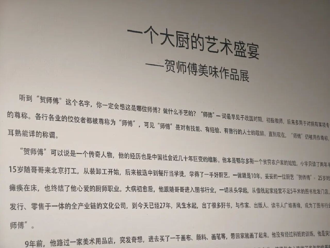 这就是这个画展的奇幻所在,它绝对会超出日常的经验,因为这位被叫做“贺师傅”的人竟然经历了这般多的故事,还烹出了这般美味的作品,可谓珍馐美味,任君品尝。