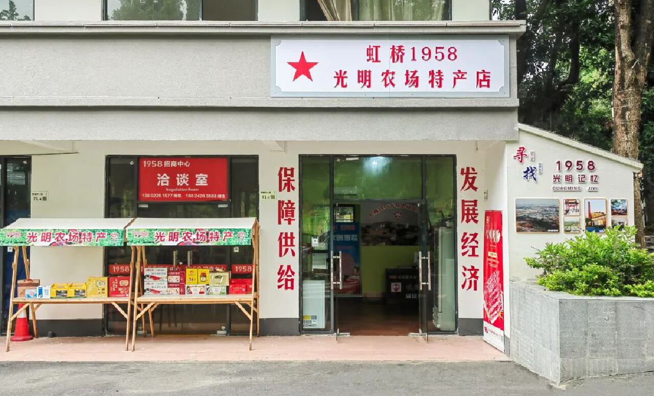 虹橋1958文化創意園作為虹橋公園周邊住宿、餐飲、娛樂等公共服務配套設施。園區設有音樂餐吧、西餐、火鍋、“光明三寶”體驗店等特色餐飲,文化休閒區域打造有書吧、1958光明農場記憶館、露營基地等。