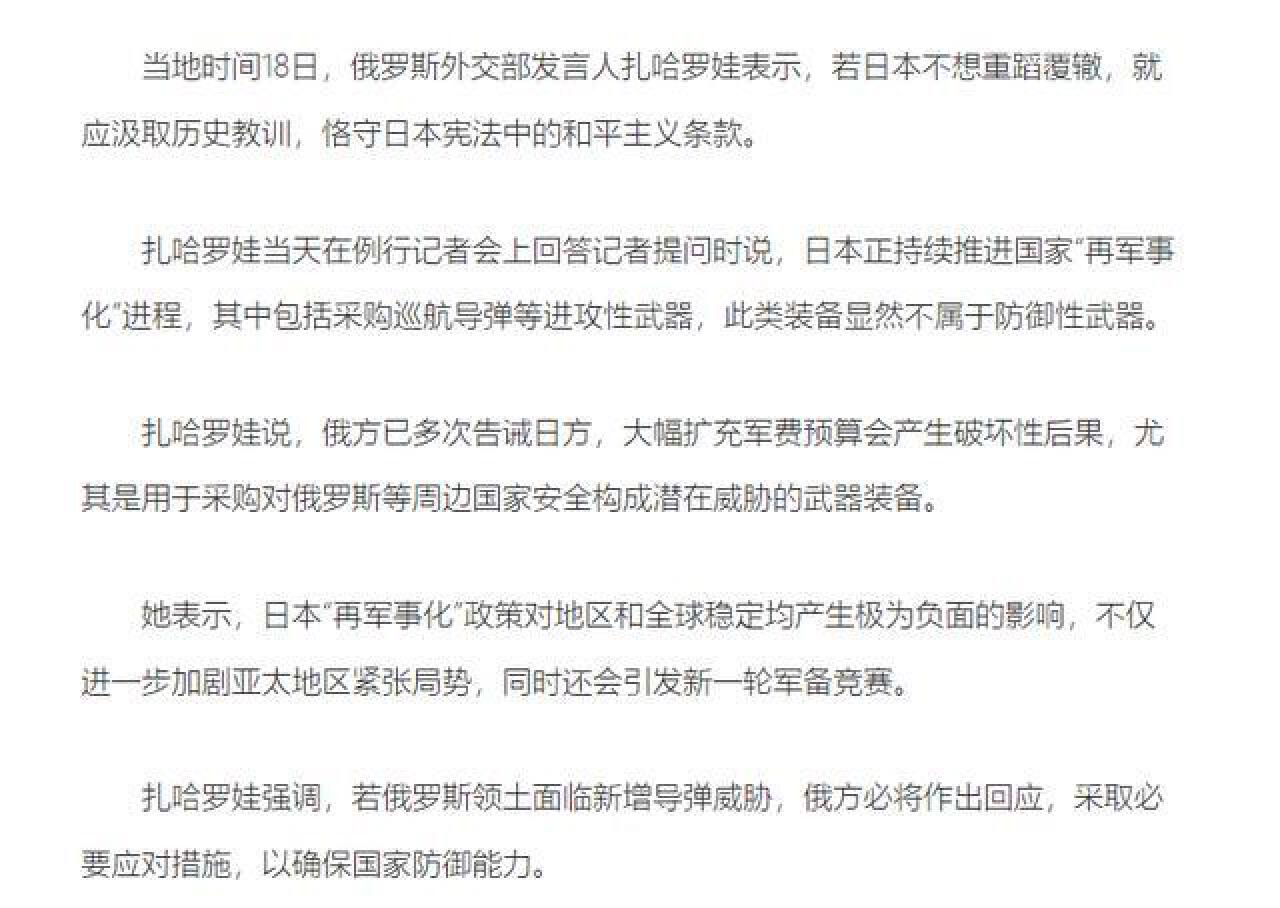 就在日本接收“戰斧”導彈後,當地時間3月18日,俄外交部發言人扎哈羅娃直接對日本發出警告。她在記者會上説,日本如果不打算重蹈覆轍,就應該老老實實地汲取歷史教訓,遵守日本憲法中的和平主義條款。