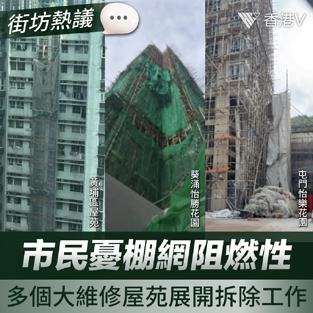 大埔宏福苑昨晚(26日)發生五級火警,為香港17年來首宗同級別大火。這次火災中,一項涉資3.3億的外牆維修工程所搭建的竹棚成為關注焦點,其棚網的阻燃性能備受質疑。有網民在社交平台透露,事件已引發連鎖反應,目前多個正進行大型維修的屋苑,如屯門怡樂花園、黃埔區屋苑及葵涌怡勝花園,正加緊拆除棚架與圍網。