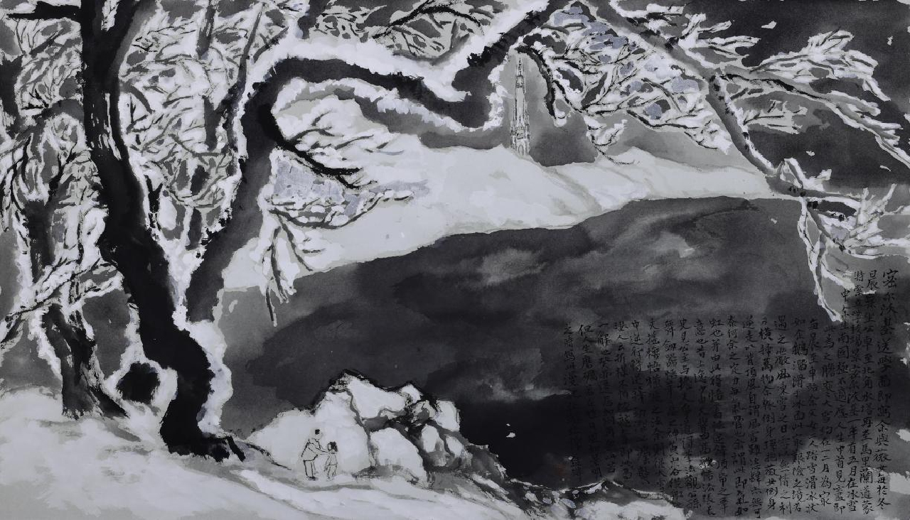展览中另一件引人注目的作品,是描绘密尔沃基冬日送学情景的水墨。画面取材于艺术家与女儿在严冬清晨踏雪而行的日常经历:父亲以背顶风,倒行而走,以保护女儿不受风雪之侵。题跋中,艺术家将这一身体经验与书法用笔相联系,由此体会到“逆锋顶纸”所需的力量与定力。这种体会并非来自临帖或理论推演,而是在与现实环境的反复对抗中逐渐形成。值得注意的是,“逆锋顶纸”在此不仅是一种技法层面的用笔选择,也隐含着一种姿态:在并不总是友善的文化环境中,文人艺术并非随势而流,而是以自身的节奏与尺度,保持独立而清醒的行进方向。生活经验在这里并未被抒情化,而是转化为对笔墨实践的切身理解,延续了文人艺术中由行旅、困顿与日常生成艺术体悟的传统路径。