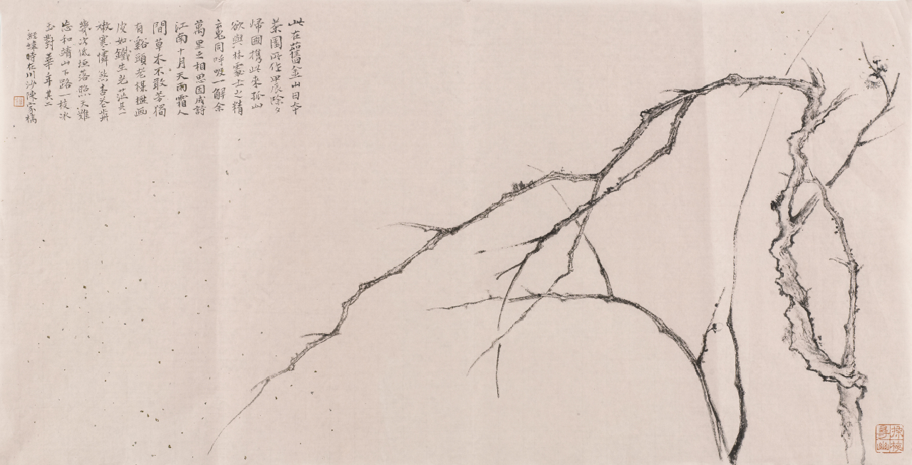图五:旧金山日本茶园画梅册(1),水墨,日本80年代纯楮皮洒金纸,尺寸:65cm×34cm,日期:2022年,2024年。题跋:此在旧金山日本茶园所作。甲辰除夕归国,携此来孤山,欲与林处士之精魂同呼吸,一解余万里之相思。因成诗:江南十月天雨霜,人间草木不敢芳。独有溪头老梅树,画皮如铁生光芒。其一。嫩寒怜煞杏花前,几次低垣落照天。难忘和靖山下路,一枝冰玉对花年。其二。经纬时在川沙陈家桥。
