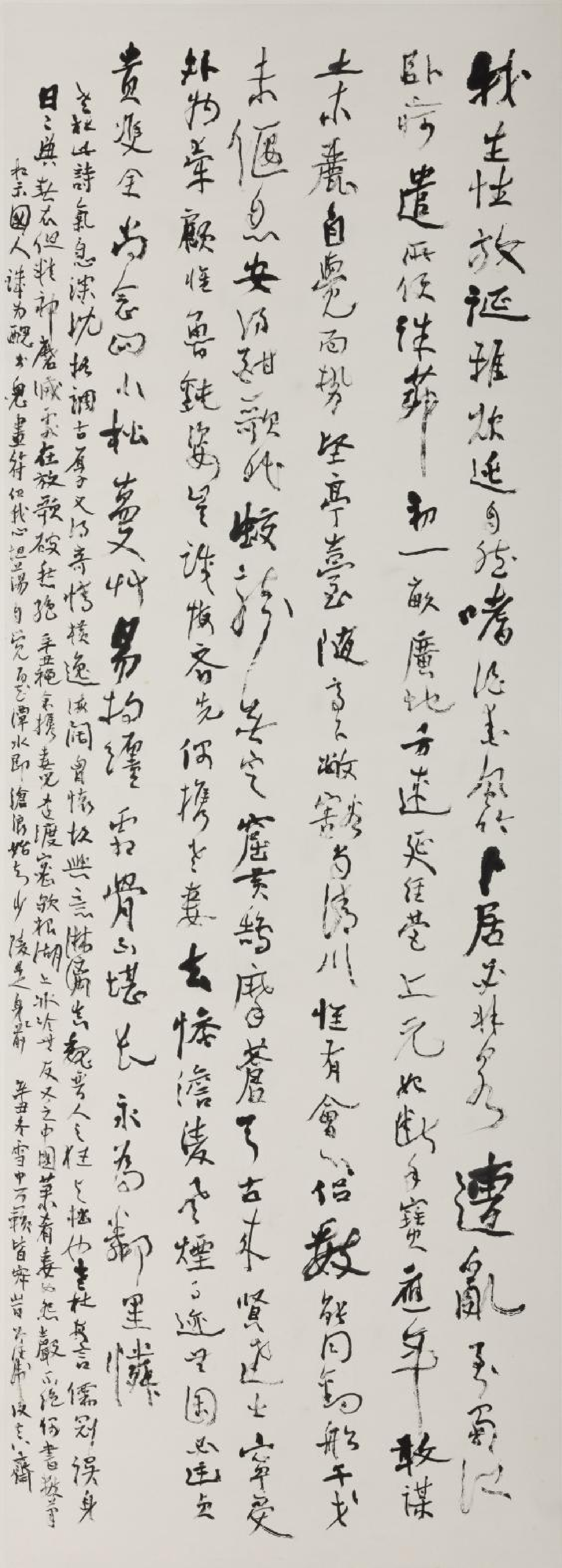 图六:杜少陵《寄题江外草堂》书法,水墨,旧红星纸,尺寸:153.5cm×54.5cm,日期:2021年。 题跋:老杜此诗气息深沉,格调古厚,又得奇情横溢,海阔胸怀,故兴意淋漓,真魏晋人之狂与拙也。老杜每言,「儒冠误身」,「日日典春衣」,但精神磨灭处,在「放歌破愁绝」。辛丑秋,余携妻儿远渡密歇根湖上,冰冷无友,又乏中国菜肴,妻女怨声不绝。偶书数笔,相示国人,讥为丑书、鬼画符。但我心坦荡,自觉百花潭水即沧浪,始知少陵是前身。辛丑冬雪中,万籁皆寂时,曾经纬复真斋。
