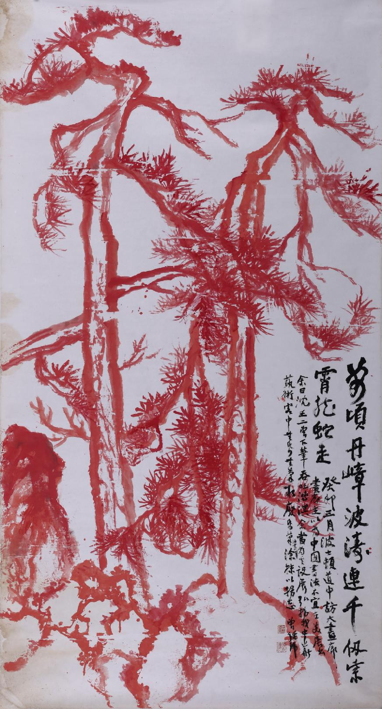 图三:笔走龙蛇,印度纸,西洋颜料,尺寸:179cm×97cm,日期:2023年。 题跋:万顷丹嶂波涛连,千仞紫霄龙蛇走。癸卯三月,波士顿道中,访大画廊。画廊主以为,中国书法不宜在美展出。余曰,沈王刘曾,下笔吞吐鸿溟,余当为其设展,弘扬我中华艺术。客中无纸无笔,取废纸笔(油画棒)涂抹以扬志,曾经纬。经纬注:沈王刘曾即沈鹏、王镛、刘正成、曾来德四位先生。此作以印度纸、油画笔一挥。