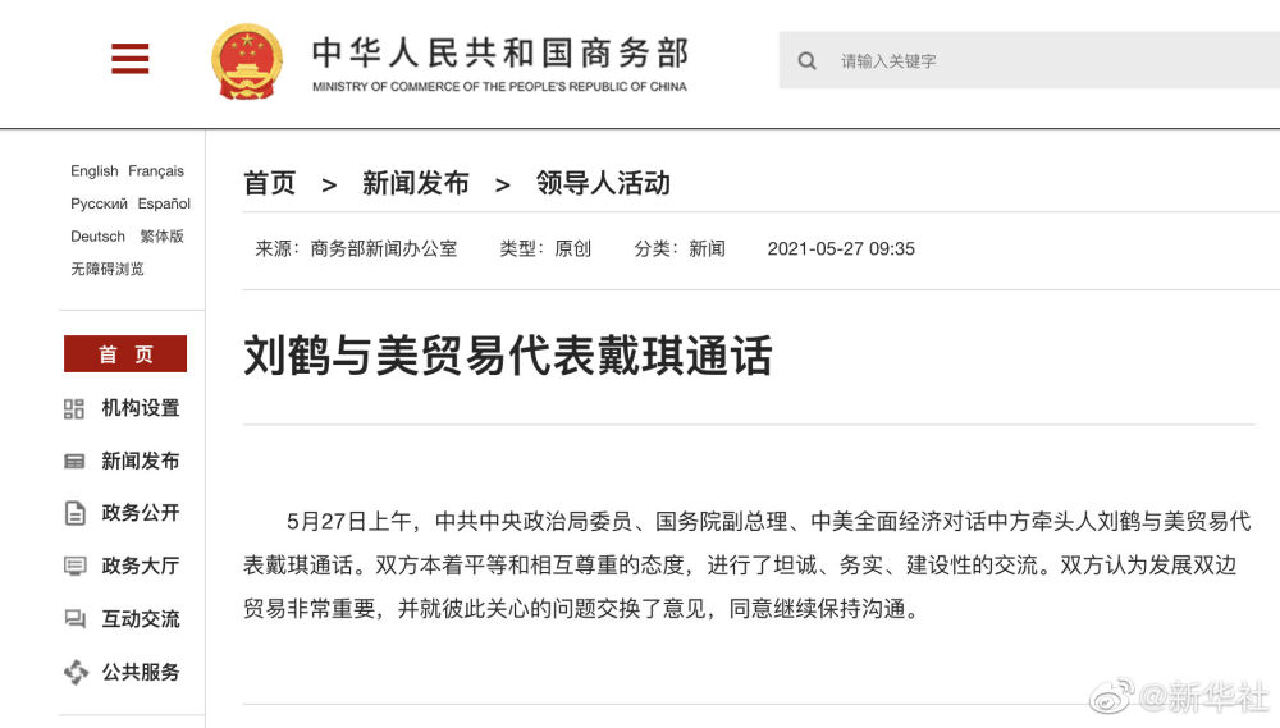 5月27日上午,中共中央政治局委员、国务院副总理、中美全面经济对话中方牵头人刘鹤与美贸易代表戴琪通话。双方本着平等和相互尊重的态度,进行了坦诚、务实、建设性的交流。双方认为发展双边贸易非常重要,并就彼此关心的问题交换了意见,同意继续保持沟通。