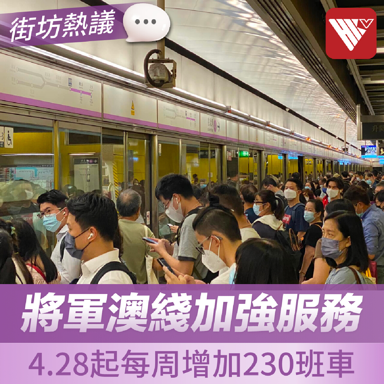 為方便將軍澳沿綫居民出行,下周一(4月28日)起,港鐵將軍澳綫平日非繁忙時段會加強服務,往來北角站至寶琳站加密至約每4.5分鐘一班,往來調景嶺站至康城站的列車調整至約每9分鐘一班,每周增加230班車。