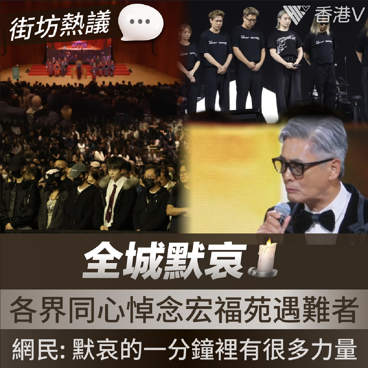 香港大埔宏福苑於11月26日發生嚴重五級火警,造成逾百人傷亡,全城陷入悲痛。事故發生後,不同社會場合陸續出現自發性默哀活動。