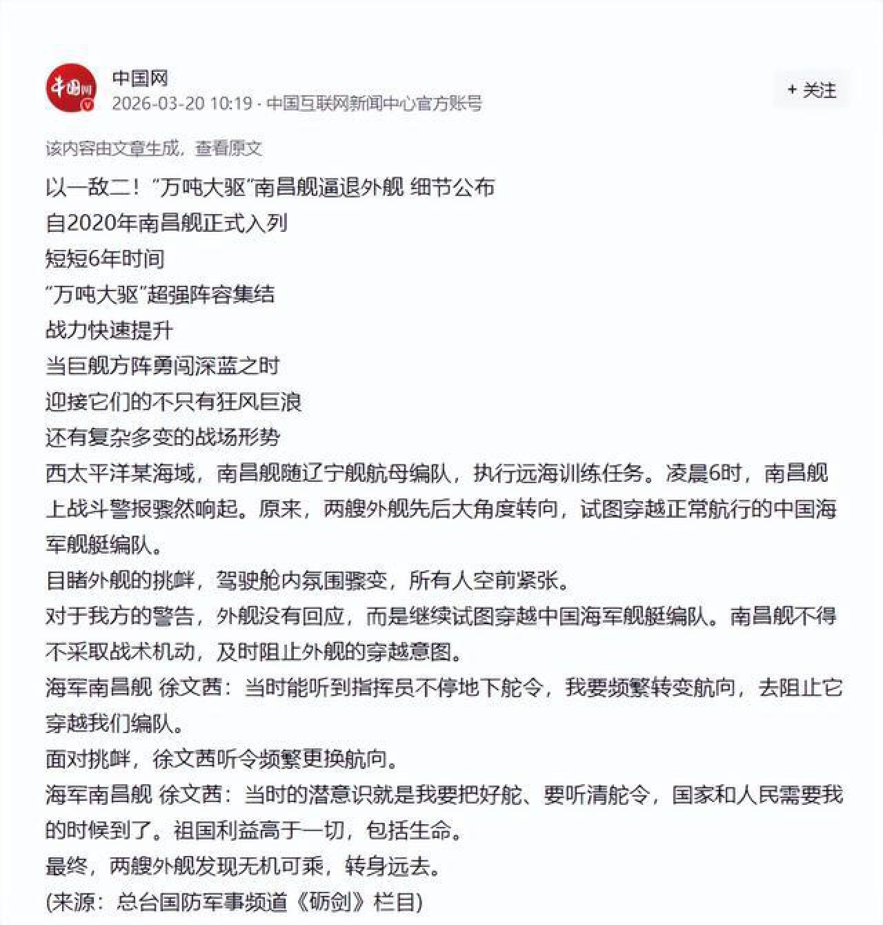 3月20日,央視國防軍事頻道《礪劍》欄目公佈了一條消息,055首艦南昌艦在隨遼寧艦航母編隊去西太平洋某海域執行遠海訓練期間,曾“以一敵二”成功驅離外艦。
