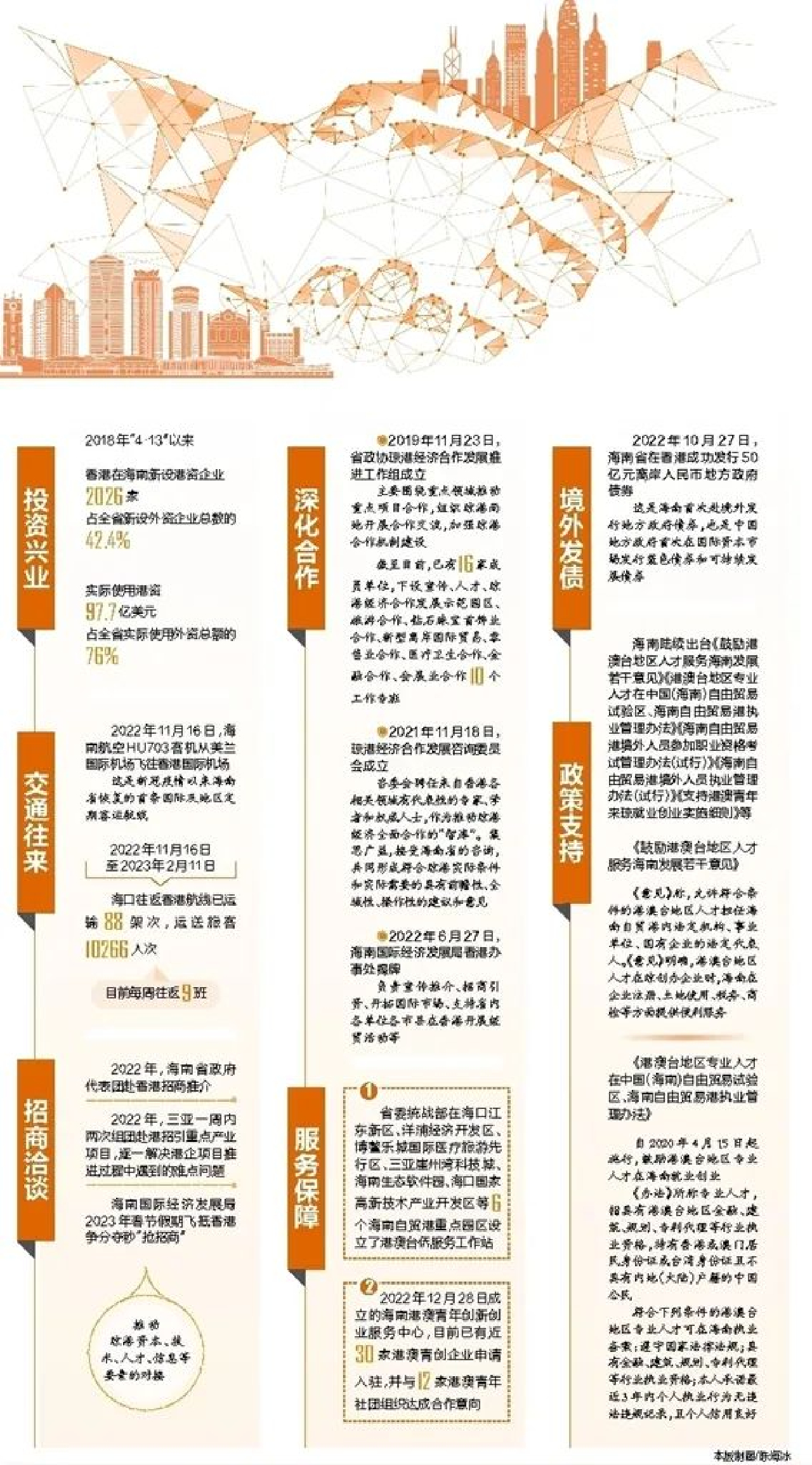 成立一個半月的海南港澳青年創新創業服務中心,吸引了近30家港澳青創企業申請入駐,並與12家港澳青年社團組織達成合作意向;中國海南自由貿易港瓊港澳服務業合作示範區帶動旅遊服務、文化貿易、影視服務、體育服務、創新金融等產業資源集聚……