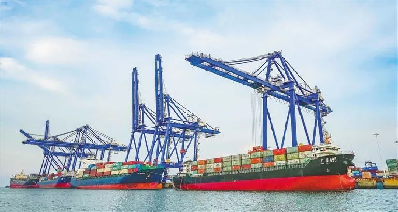洋浦國際集裝箱碼頭,幾艘輪船停靠在港口裝卸集裝箱。海南日報記者 陳元才 攝
