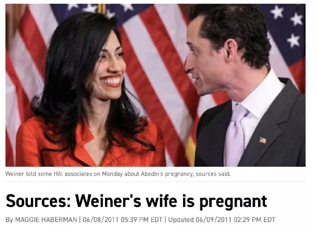 2011年的五月底是一个长周末,韦纳的丑闻已经从八卦小报,蔓延到了美国主流媒体。当时阿贝丁怀孕快12周了,夫妻俩开始商量着要怎么告诉亲朋好友这个喜讯。但是还没等他们亲口宣布,全世界都知道阿贝丁怀孕了。因为随着媒体挖掘韦纳的丑闻,她也被连带卷入了这场drama.