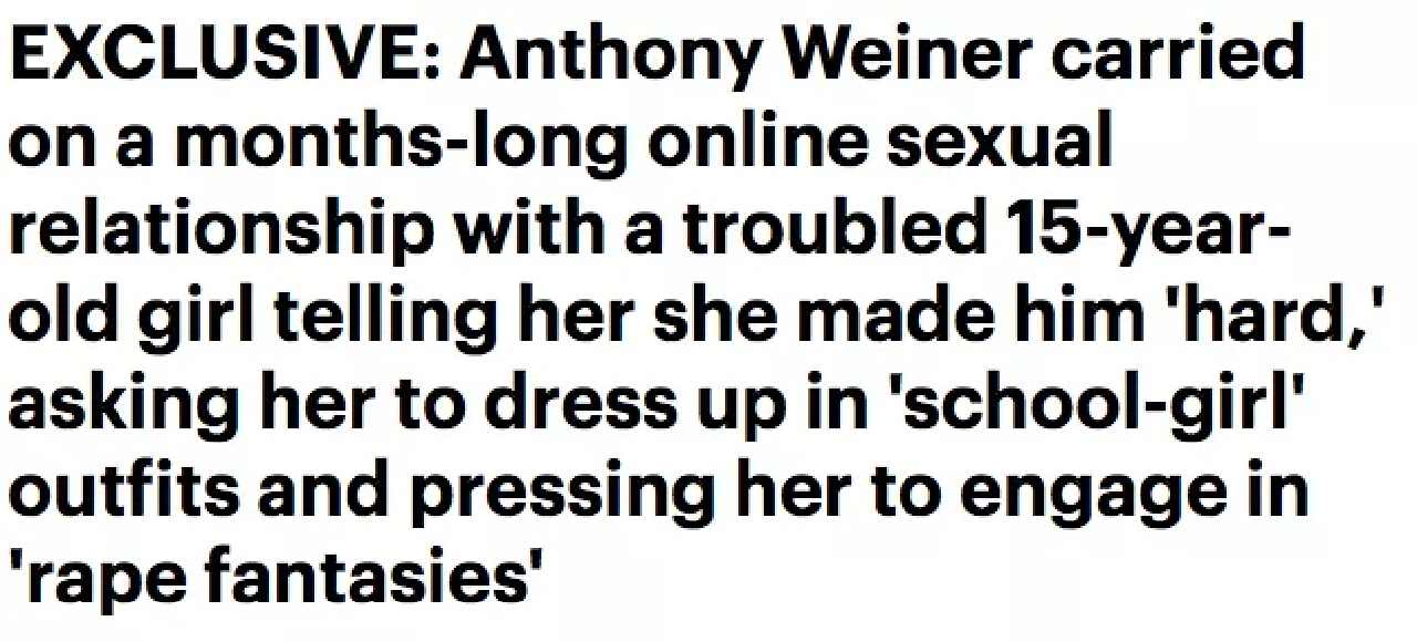 而这些还不是最糟糕的,三个星期后,2016年9月21日,《每日邮报》爆出了韦纳向未成年少女发送色情短信。每一条丑闻都在刷新阿贝丁对韦纳下限的认知。
