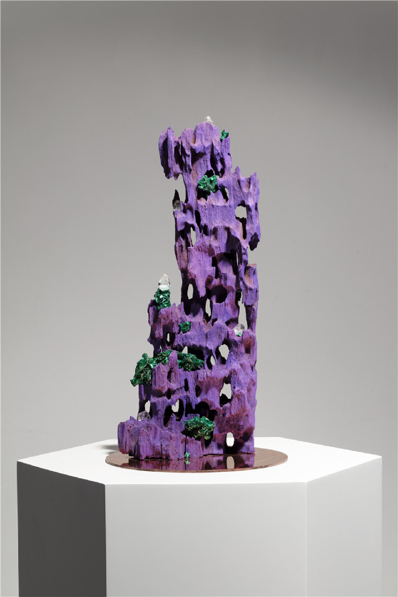 在这一体系中,紫色与矿晶不断出现。它们并非作为符号被使用,而更像是在创作中自然浮现的语言。紫色既不是单纯的色彩选择,也不是某种文化隐喻,而更接近一种频率,一种在不同作品中反复显现的状态。矿晶则保留着其自身的生成结构与时间痕迹,使作品始终与自然的生长逻辑保持某种隐约的连接。