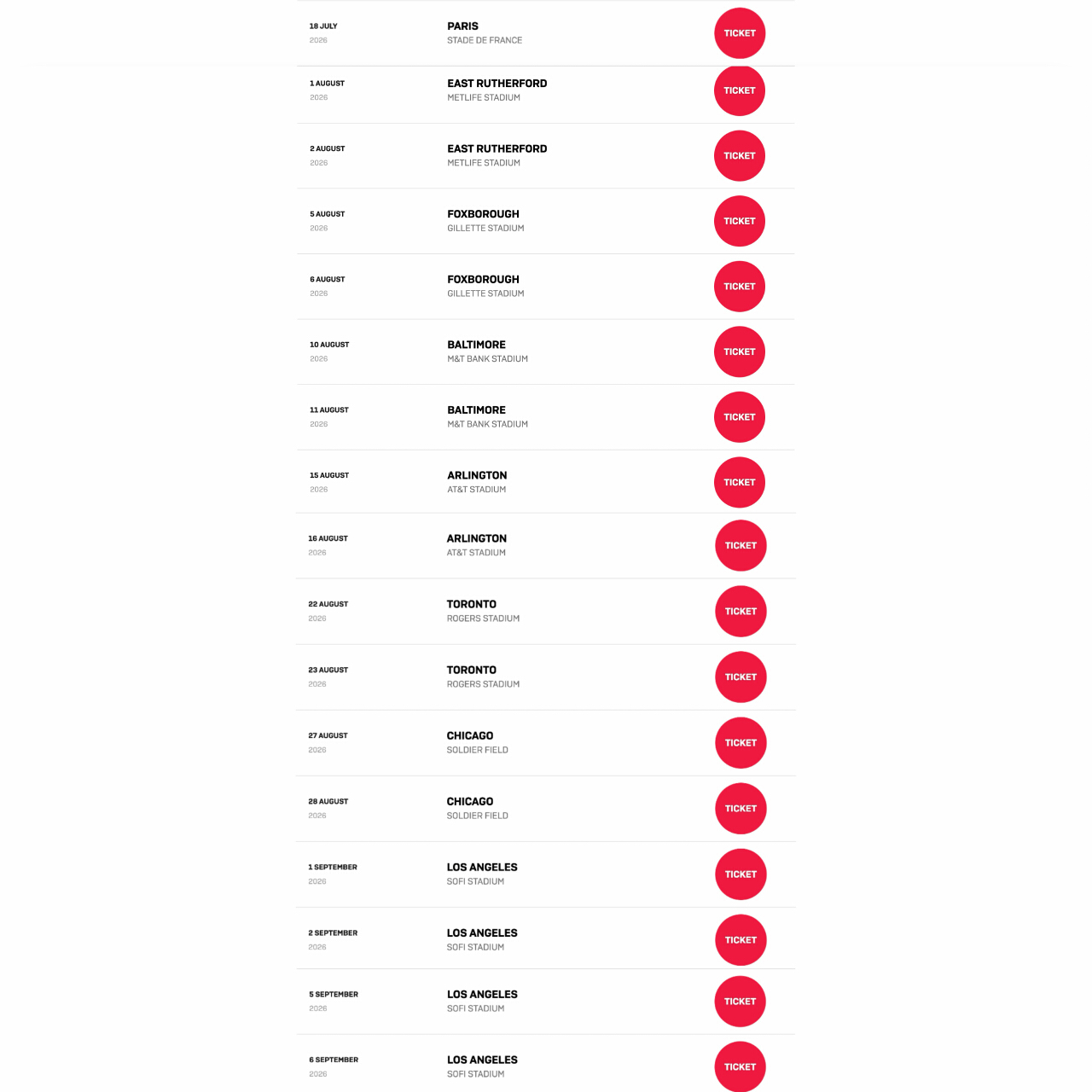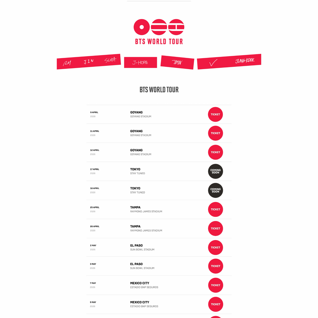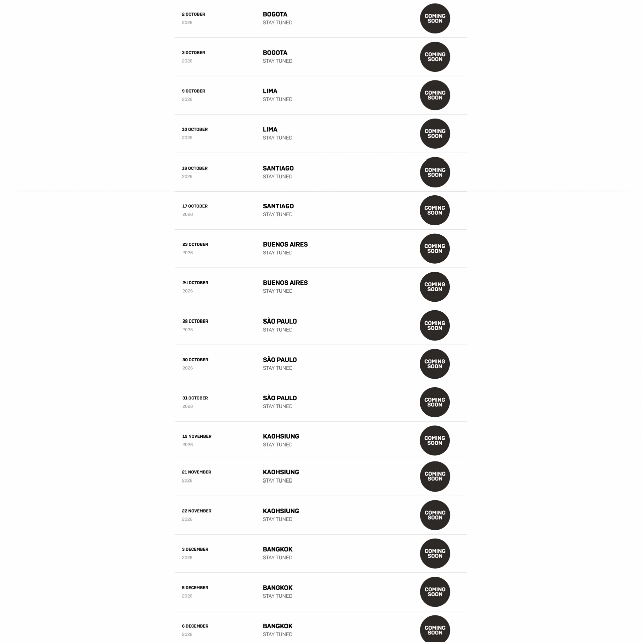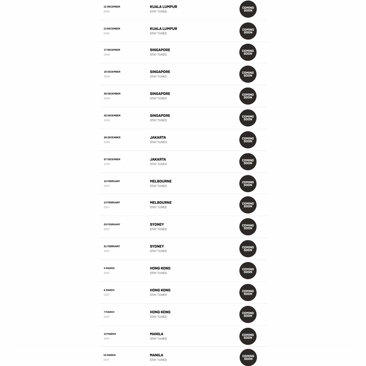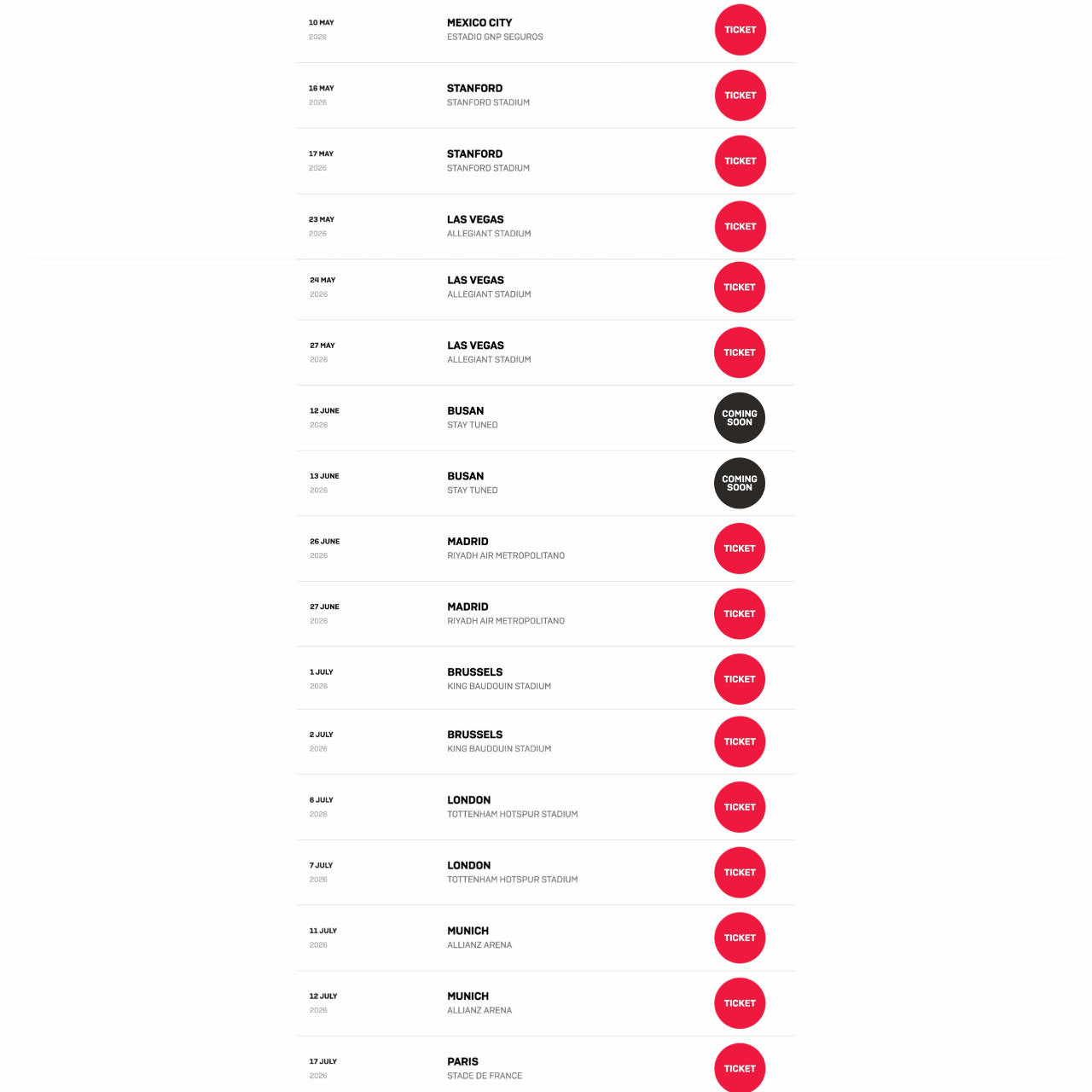 官方網頁顯示,今次巡演涉及34個城市,橫跨2026至2027年。2026年,成員們將去到高陽、東京、坦帕、埃爾帕索、墨西哥城、史丹福、拉斯維加斯、釜山、馬德里、布魯塞爾、倫敦、慕尼黑、巴黎、東盧瑟福、福克斯堡、巴爾的摩、阿靈頓、多倫多、芝加哥、洛杉磯、波哥大、利馬、聖地亞哥、布宜諾斯艾利斯、聖保羅、高雄、曼谷、吉隆坡、新加坡及雅加達演出;2027年則將前往墨爾本、悉尼、香港及馬尼拉。