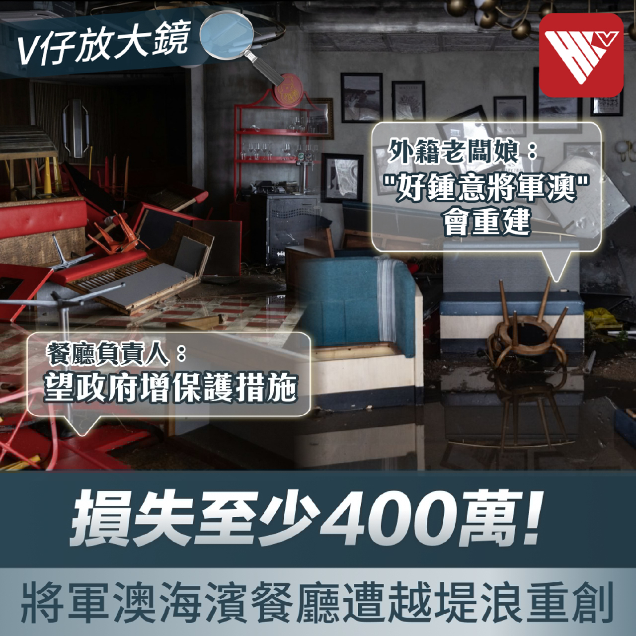 另一間餐廳店主表示,此次颱風威力歷來罕見。他提到,2017至2018年後附近雖已加建防波牆,但今次海水仍越牆造成破壞。他認為並非工程無效,而是該區臨海,無論住宅或商舖均存在一定風險。