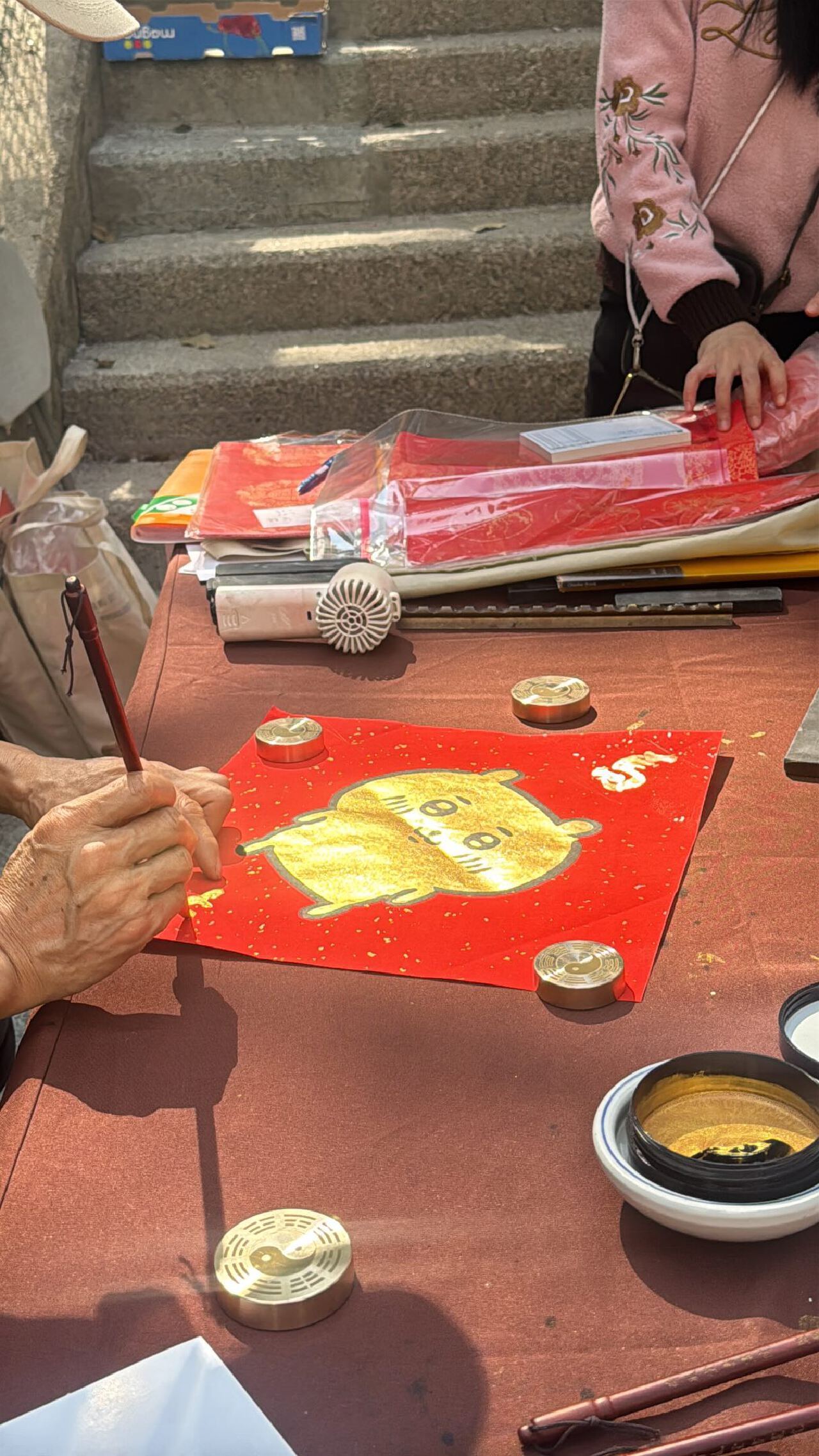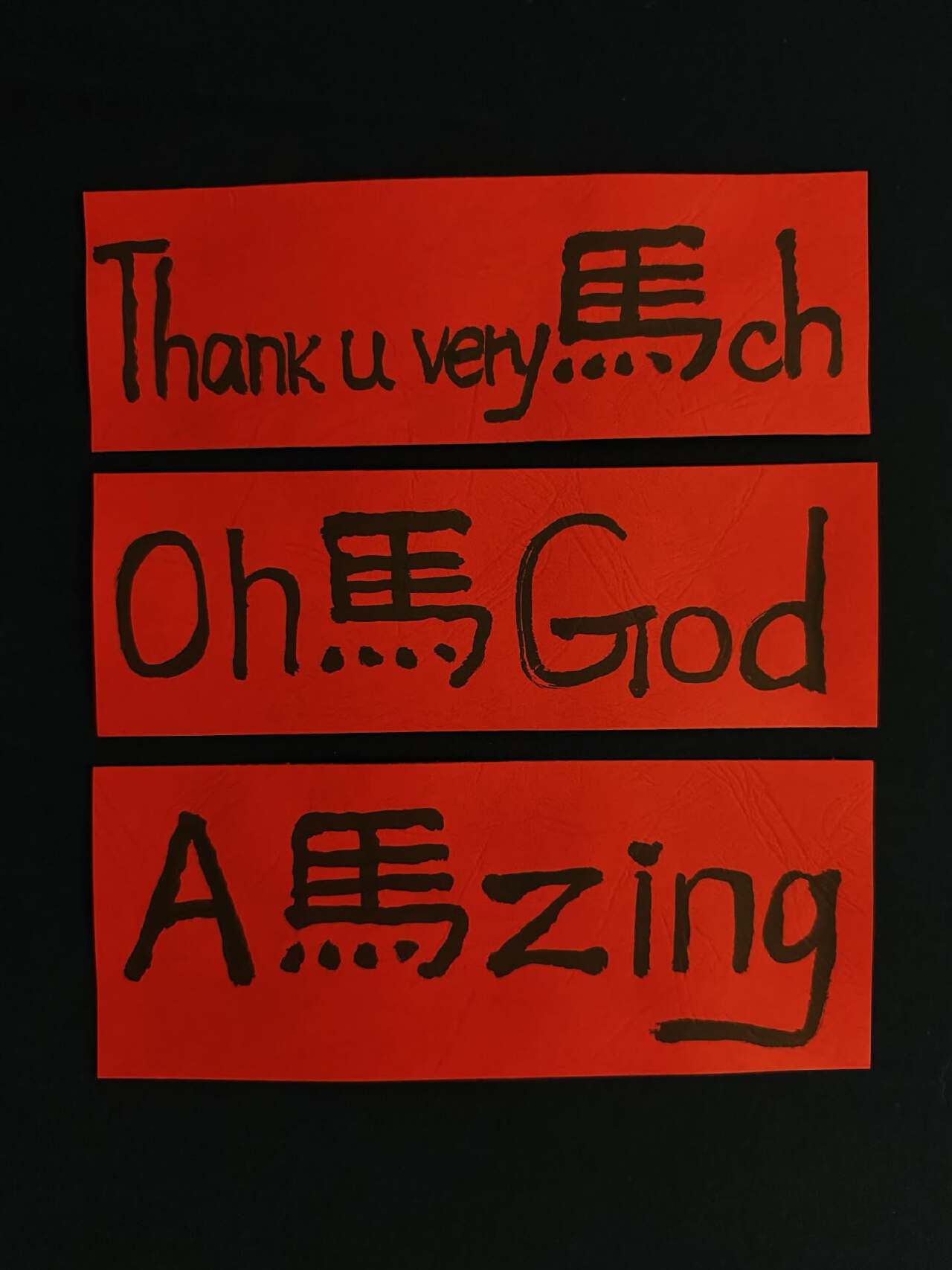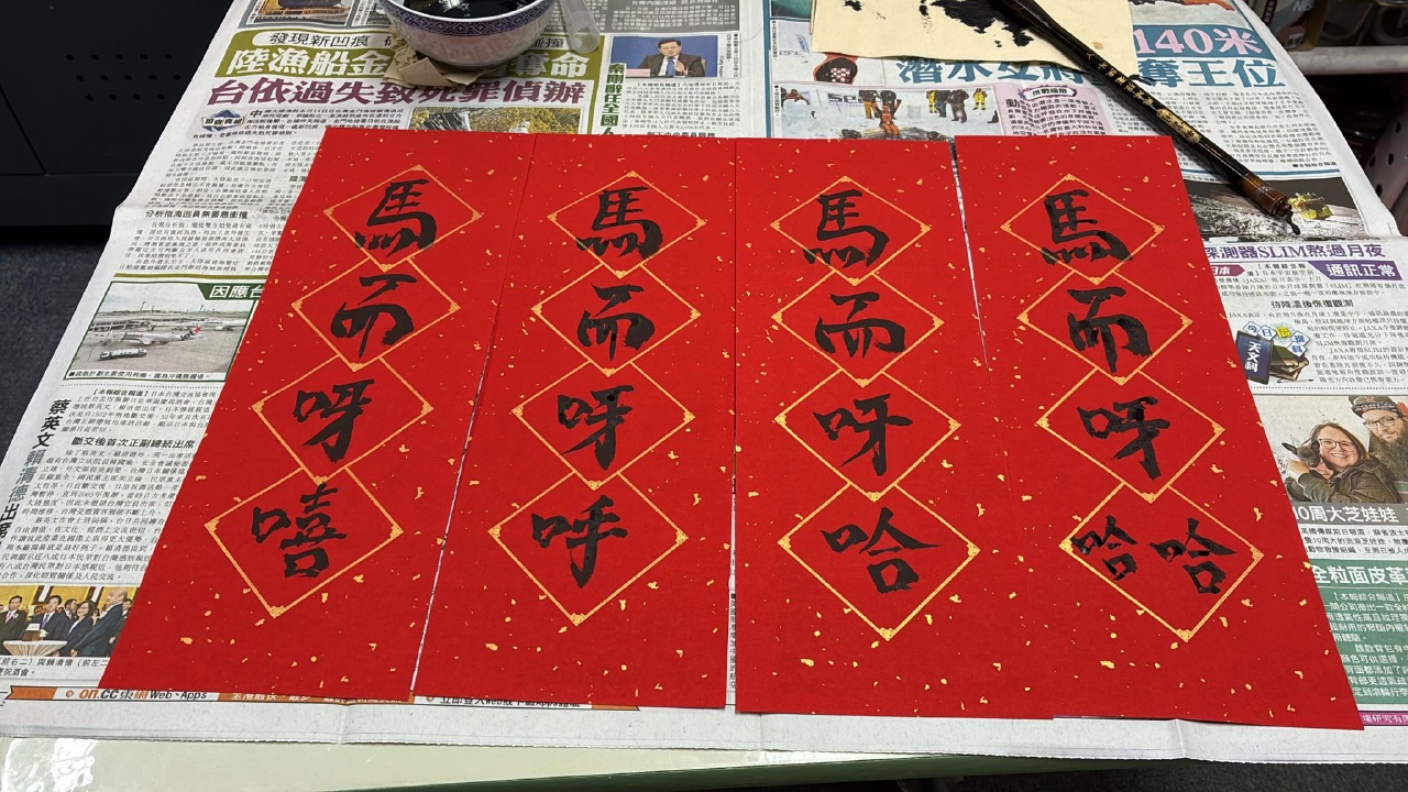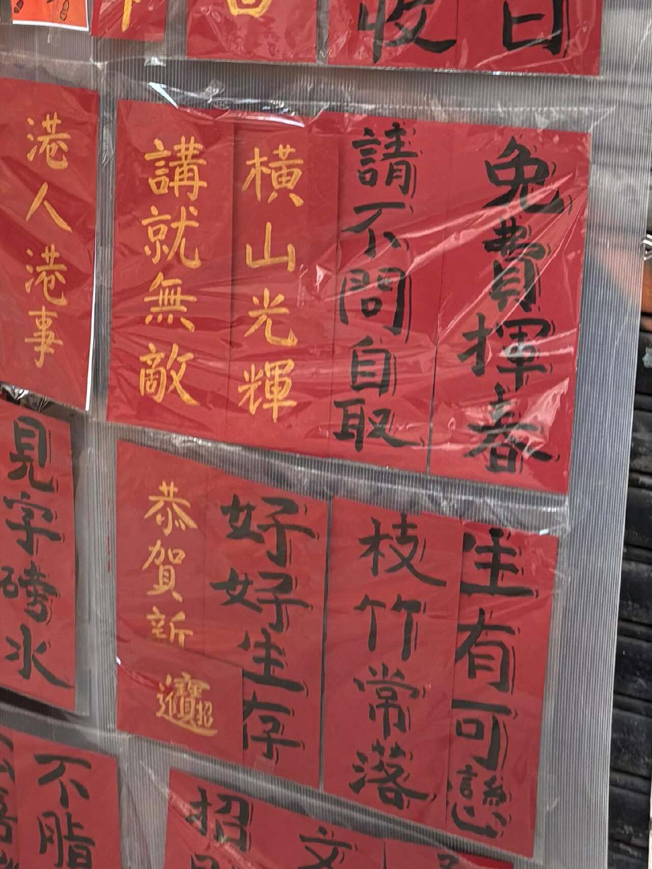 創意揮春不單止一款!有人將新加坡歌手郭美美《不怕不怕》的歌詞改作馬年揮春“馬而呀嘻、馬而呀呼、馬而呀哈、馬而呀哈哈”;亦有人中英合璧,寫出“Thank u very 馬ch”“A馬zing”;另有市民免費派發揮春,內容包括“生有可戀”“枝竹常落”等趣怪字句;更有寫揮春的伯伯為年輕人畫上金色Chiikawa,將潮流動漫角色融入傳統節慶。