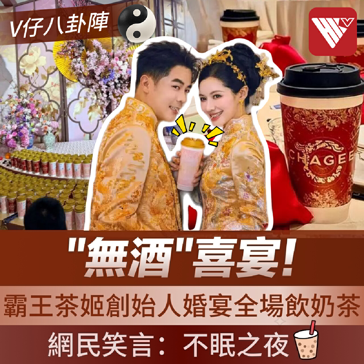 據現場嘉賓分享的照片所見,會場佈置成一片花海,並設有大型展示台擺滿霸王茶姬飲品,包括招牌產品“伯牙絕弦”等供賓客自由取用,二人亦拍攝了共飲一杯奶茶的婚紗照。這項“以奶茶代酒”的創意安排令不少網民笑稱“結婚不忘打廣告”“以茶代酒更健康”,亦有網民聯想到“喝奶茶失眠”而留言戲稱:“今晚大家不用睡了”“這是不眠之夜”。